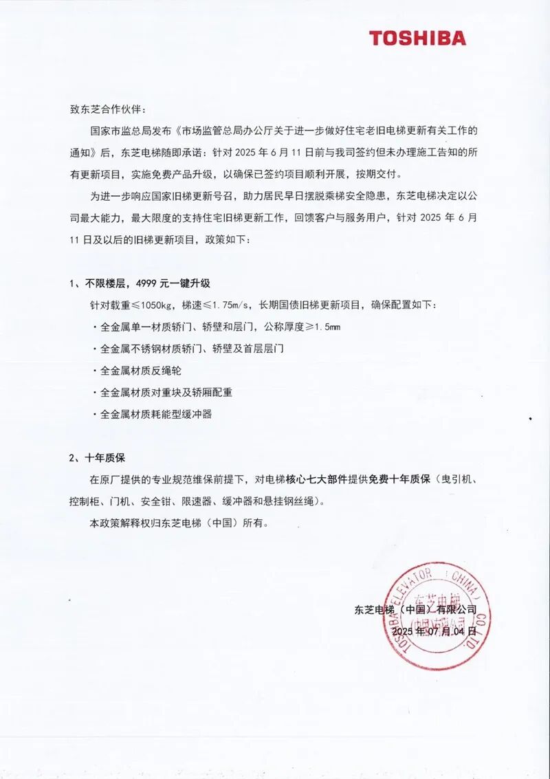 此前,东芝电梯已官宣对于2025年6月11日前已签约,但尚未办理施工告知的所有更新项目,东芝电梯全额承担因满足新规要求产生的产品升级费用,合同价格不变。彻底免除客户因新规导致的成本追加与业主反复征询的时间损耗,确保项目按时、合规推进。