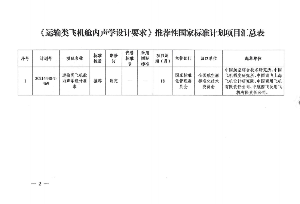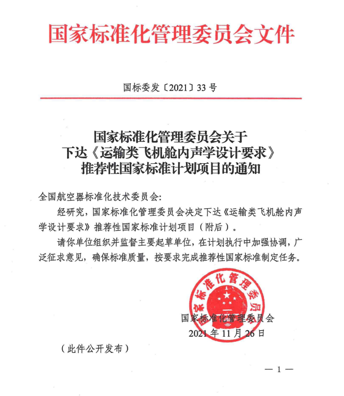 国家标准化管理委员会关于下达《运输类飞机舱内声学设计要求》推荐性国家标准计划项目的通知