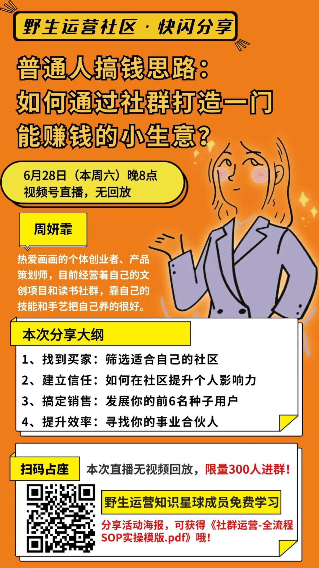 本周六晚8点,我邀请到妍霏,目前经营着自己的文创项目和读书会,靠自己的手艺和技能把自己养的很好,会带来分享:《普通人搞钱思路:如何通过社区打造一个赚钱的小生意》。