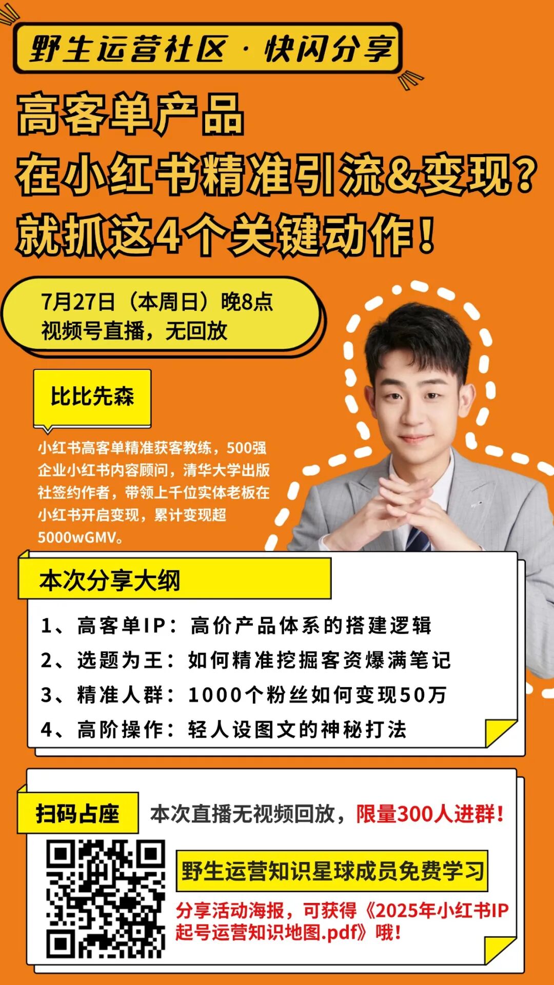 感兴趣的朋友,戳海报来报名吧!参与直播并分享海报,还有机会获得《2025年小红书IP起号运营知识地图.pdf》哦。