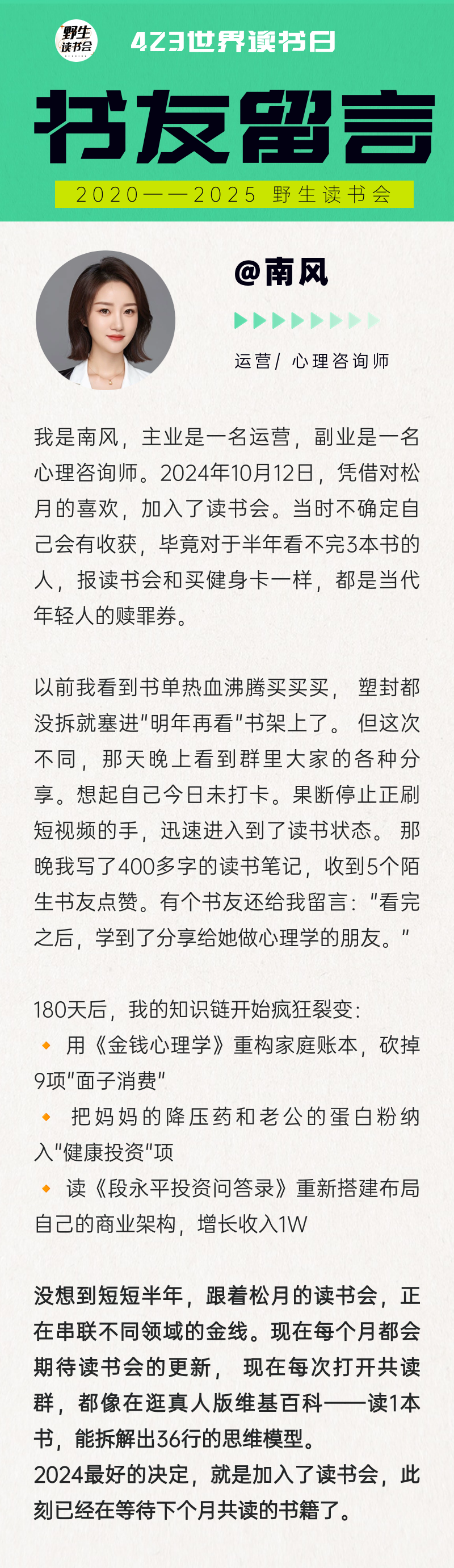我们也提出了「野生读书会」的「人生五事」,也由此得到我们的「选书方向」:身心发展、认知升级、商业经营、创作输出和理财生财。希望每个伙伴都能在这里用书籍成就自己。