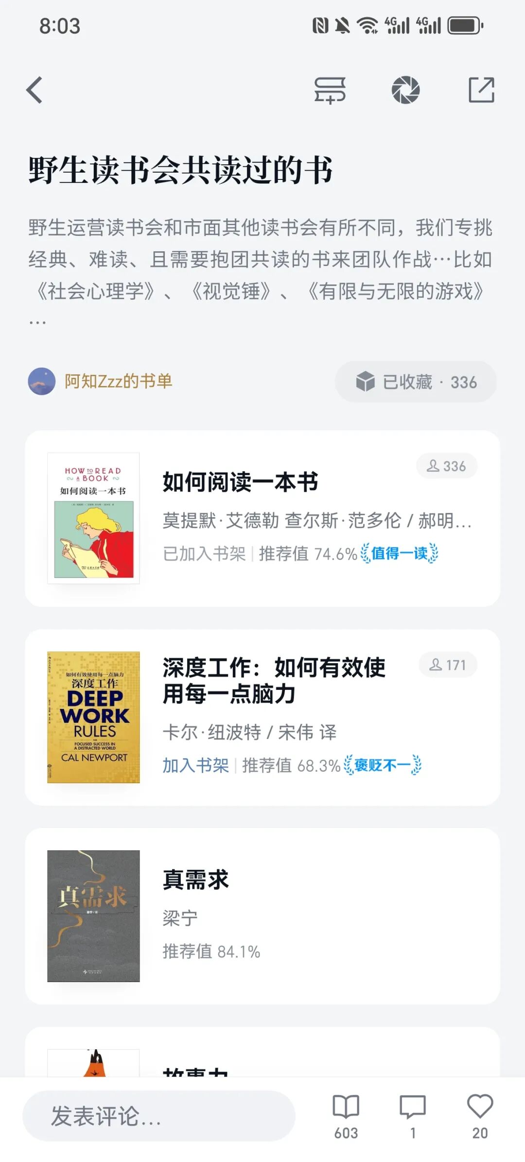 我现在每天早上起床会读半个小时的书,雷打不动,因为我有一种执拗:脑子被正餐喂饱了,是不是不会想吃零食(短视频之类)的?睡觉前,我会在「野生读书会」知识星球里“刷书”,每天零碎的时间加起来会有 1 个多小时里在这里泡着。