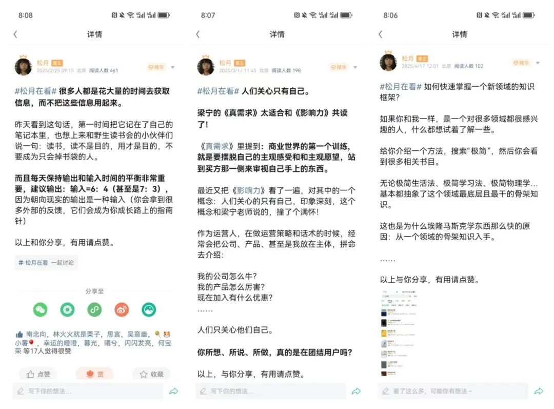 另外每月还有自由打卡活动,除了共读的14天,我们希望大家根据自己的热爱和正在投入精力的领域,自主的选择书籍来读,读完后继续笔记一篇发到星球,同时你也可以看到别人都在读什么,别人都从这本书里获得了什么,别人是怎么用这本书的……不仅是对书种草的过程,而且通过向同伴学习的方式,你会看到更多人读书的姿势,为你所用。