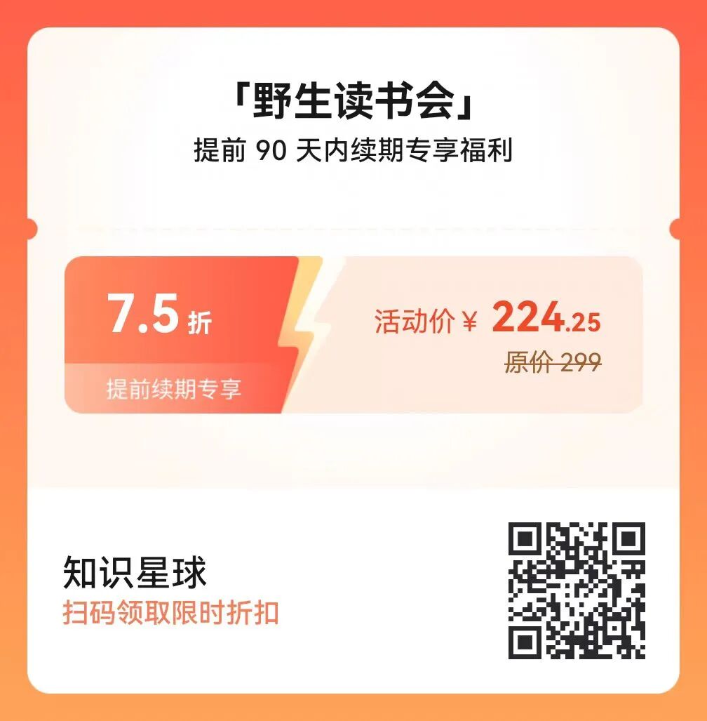 今天活动最后1天,「野生读书会」知识星球全年加入&续费最低价,24点涨价咯!下面是本次活动优惠信息。
