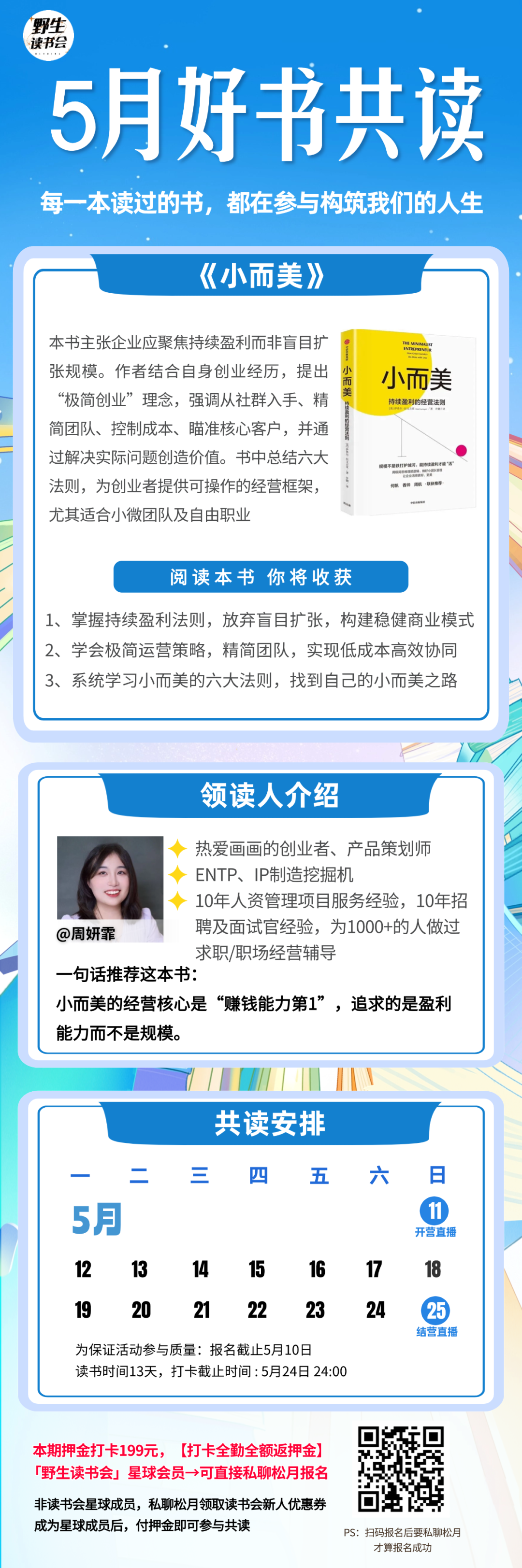 「野生读书会」5月共读开始啦,5月11日~5月25日,我们会读这本《小而美》,如果你也想成为一名有赚钱能力的个体,就千万别错过啦~扫码报名后记得私聊松月,才算报名成功哦,报名后松月会发你电子版,就可以开始预习起来啦!