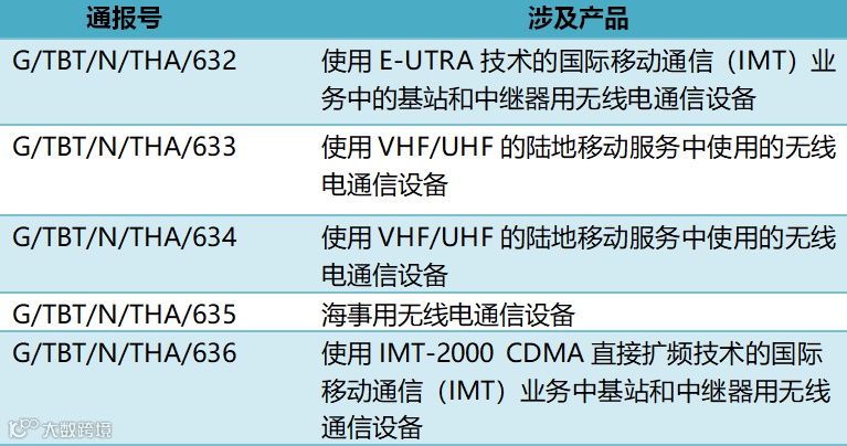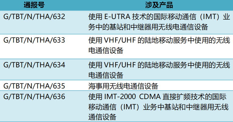 2021年10月11日,泰国通报了5项无线电通信设备相关技术性贸易措施,通报情况如下表:
