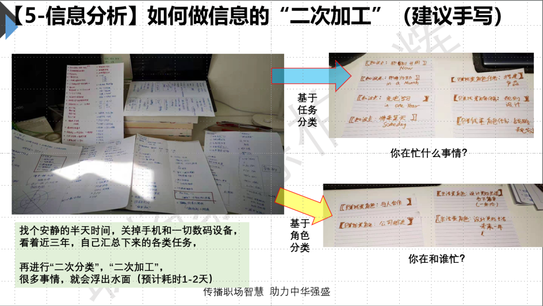 最后进行任务分类,角色分类,将这些事情捋清楚之后,后续的时间精力比例投入在哪里?今年要做哪些事情,家庭角色跟谁在一起,或者说没有时间精力放在谁身上。