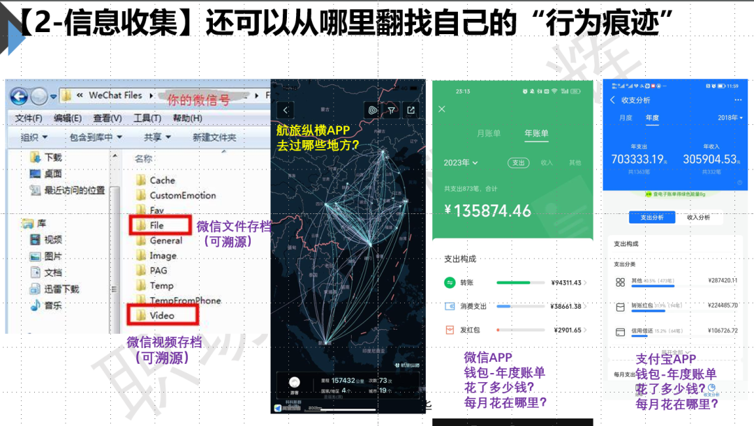 抽空看一下微信号的 file 文件当中留了哪些文件,留下哪些视频,到航旅纵横中看飞了哪些地方,看看支付记录,给人家发了多少红包,收到了多少钱,认真捋下自己的痕迹。然后再做资源上的分析,时间上的分析,盈亏平衡的收支分析,以及自己人生里程碑的分析。