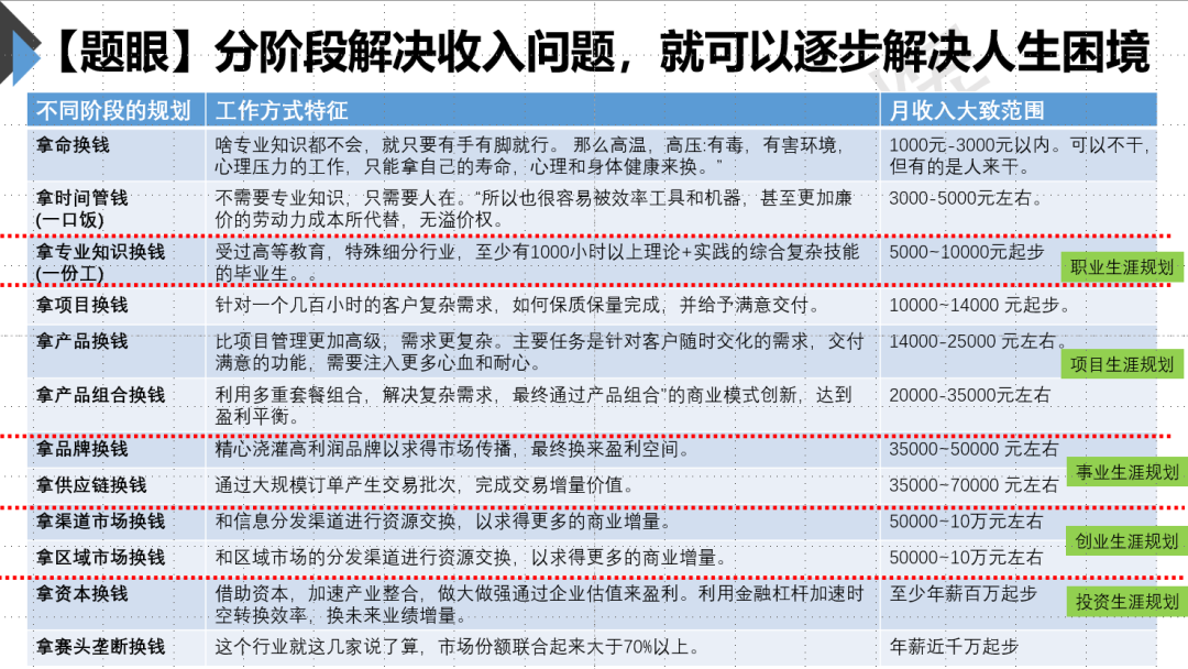 如果能把钱的问题解决了,人生的烦恼就能少一大半。如果想解决这个问题,突破困境,关键是你要分阶段去解决你的收入问题。