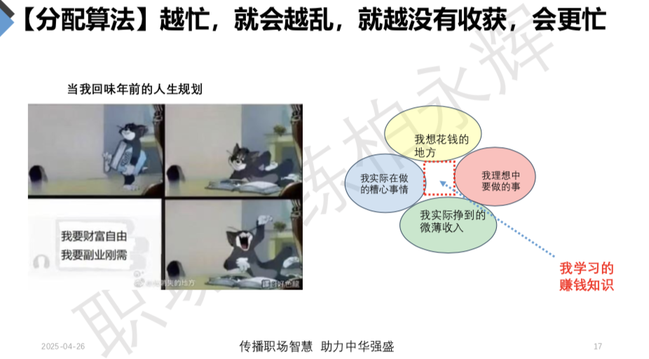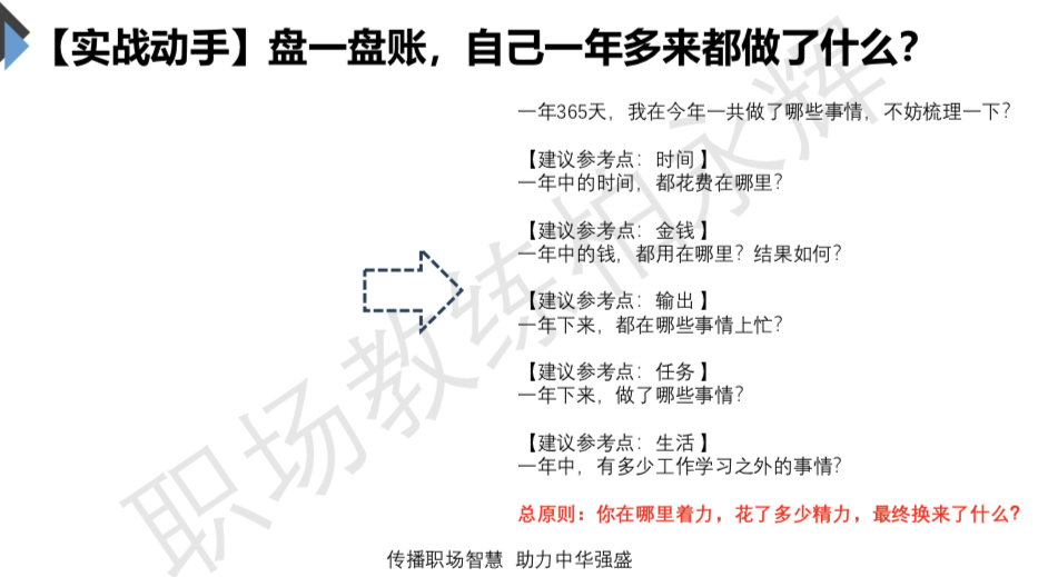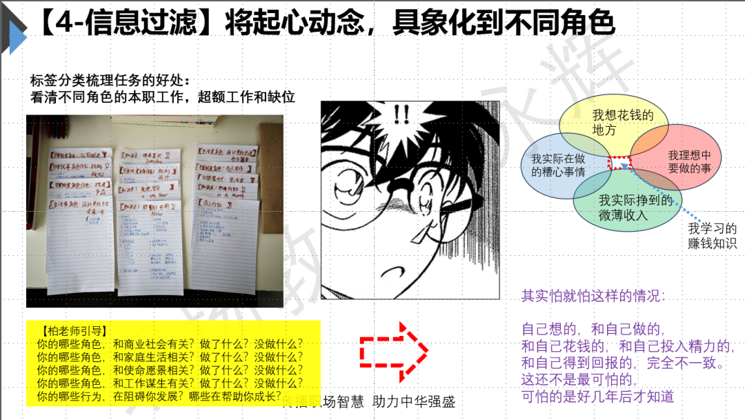 这些分析完之后,再根据自己的商业角色、家庭角色、使命愿景,工作角色干了多少个项目,认真捋一捋你就会发现,想的跟你做的和你花钱的还是完全不对位。