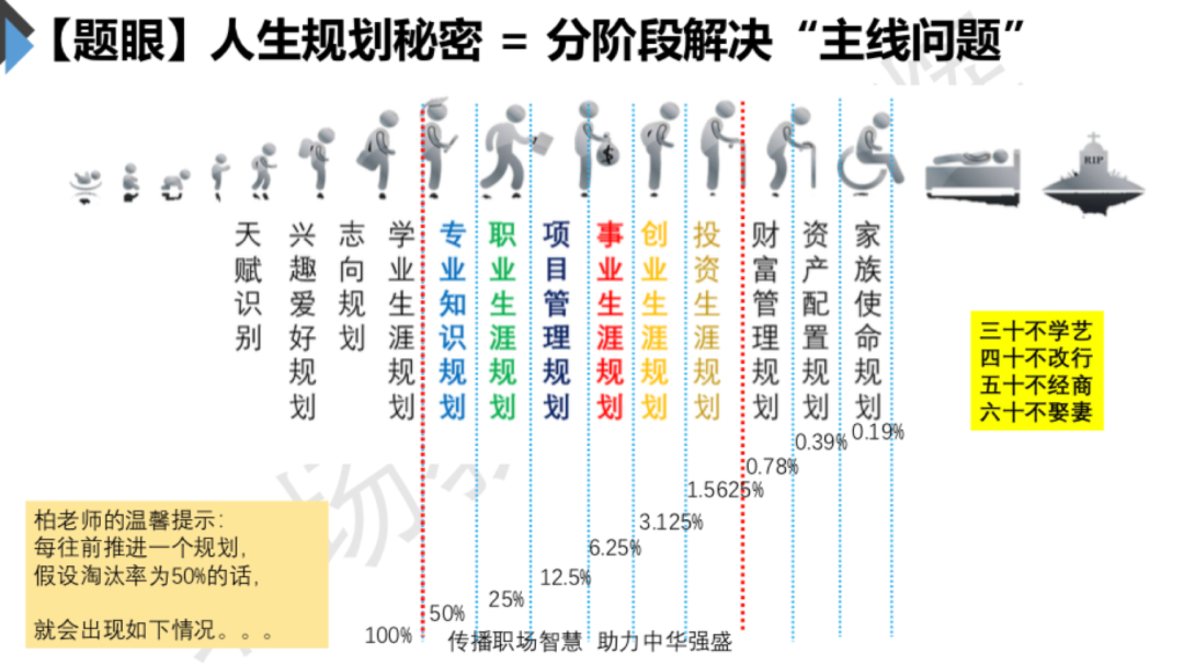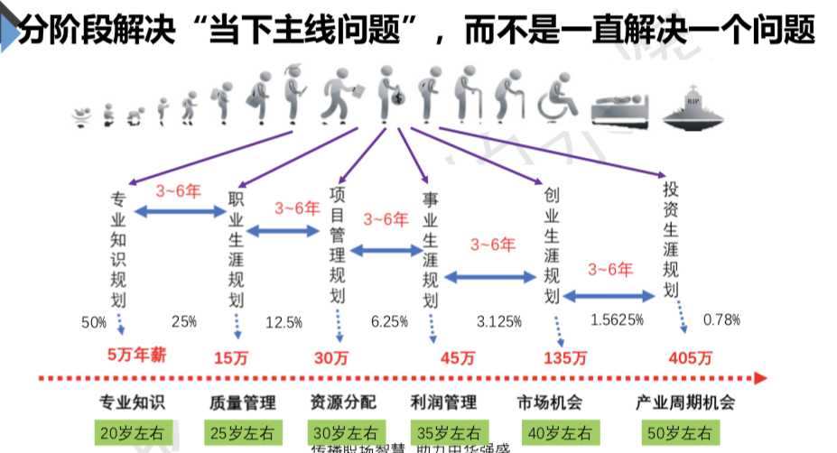 真正扎心的知识点,每段规划每往前推进3-5年,它的淘汰率是50%,再往前推进3-5年再淘汰率50%。可以看到,到项目管理规划这一层人已经很少了。因为能成为项目经理这件事本身就很难。
