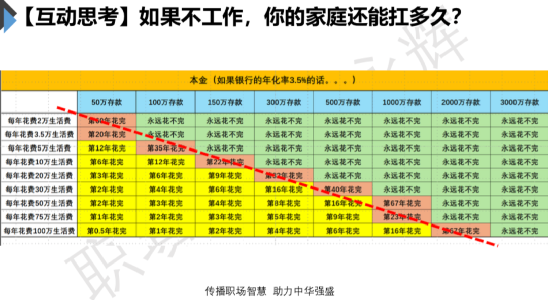 这三个问题是终极问题,是我让学员一定要思考的:当你不工作了,你的家庭能够扛得过几个月的收入,而不至于被生活的压力压得很惨。