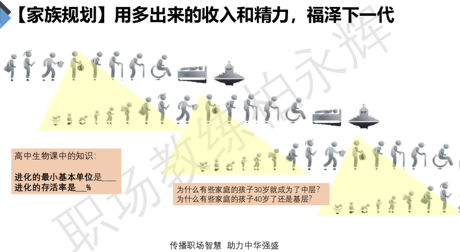 我给大家画四张图片,有爸爸,有儿子,有孙子,有爷爷,是不是大家每个人都很努力?但每个人都不能相互依靠到对方,每一代到社会上都是自己从头开始来。所以每一代都白手起家,每一代都从零开始,都接受不了经验教训。