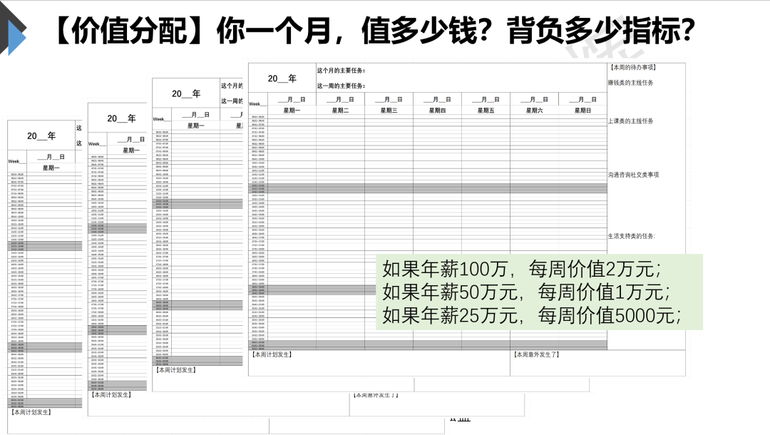举个例子,你一个月值多少钱是能够推演的出来的,假设你年薪50万,那么干一周就值一万块钱。如果你要保一万块钱利润,是不是得做十万块钱的业绩指标?为什么很多人不知道周报怎么写,写出来值多少钱的利润都写不出来,那我说我们只能说是活该的牛马。
