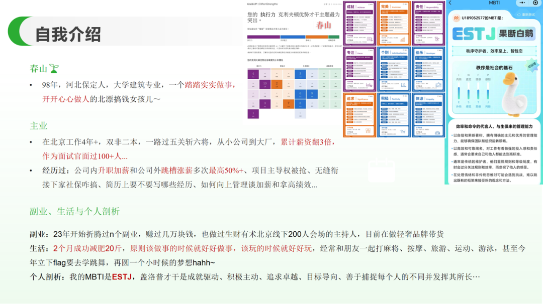 大家好,我是春山,在和大家聊职场前,我先做一个简单的自我介绍:我98 年,河北保定人,建筑专业,一个踏踏实实做事,开开心心做人的北漂搞钱女孩~
