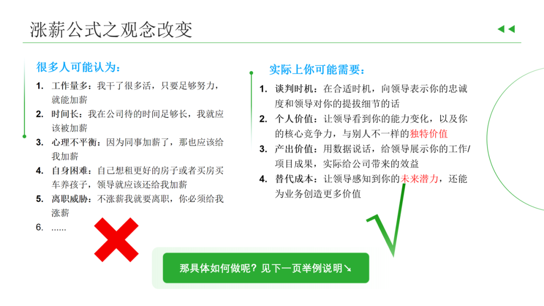 那我相信大家可能有一些惯有思维,例如我刚毕业的前两三年,也有过第一点的类似思维:我认为干了很多活,我只要足够努力,你就应该给我加薪。有没有这样同感的?觉得我只要干好了,领导你就应该主动跟我说给我加薪。