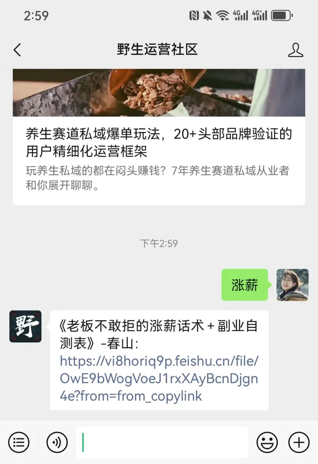 既然看到这里了,福利必须送上:春山提供的《老板不敢拒的涨薪话术+副业自测表.pdf》(足足6页),获取方法:关注野生运营社区公众号(即本公众号),回复关键词“涨薪”,即可获得(不是留言区哈),如图: