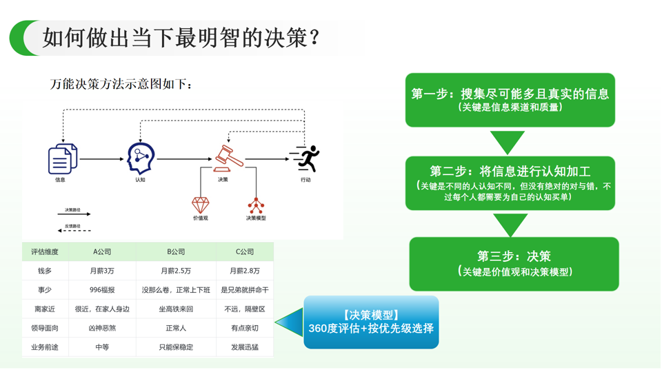 第三步:决策,那决策的时候关键点又是什么呢?就是你的价值观和你的决策模型,然后每个人的价值观都是因人而异的。
