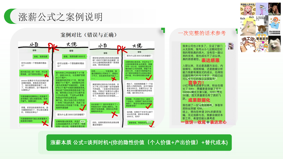 所以,涨薪本质公式=谈判时机×{你的隐性价值(个人价值+产出价值)+替代成本}