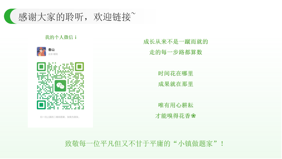 以上就是我要分享的内容啦,希望对大家有所帮助。最后再用一句话,结束今天的分享:成长从来不是一蹴而就的,走的每一步路都算数,时间花在哪里,成果就在哪里,唯有用心耕耘。才能嗅得花香!