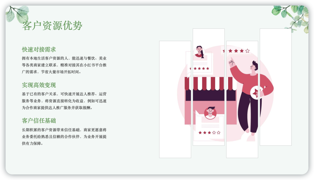 如果你曾在小红书、抖音或点评等平台工作过,那么你对这些平台的资源优势、运营模式以及发展趋势一定非常熟悉。这种背景让你能够轻松掌握平台的核心信息,同时也对本地生活的业态和商业模式有更深入的理解。这种双重优势,让你更容易与本地生活商家建立联系。