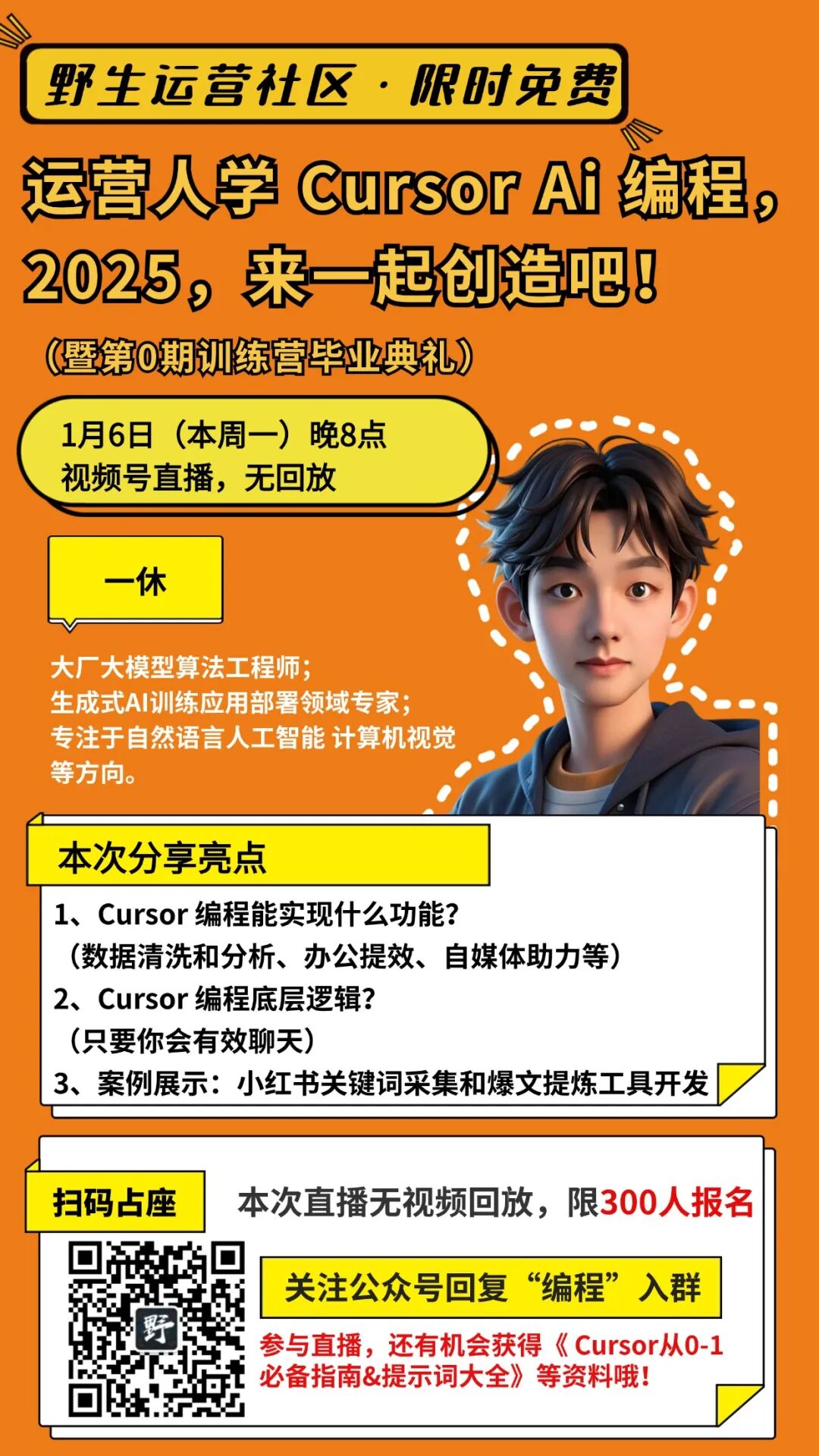 今晚8点,趁着【CursorAI 0代码14天编程训练营】毕业典礼,我们也会把直播间同时打开,关于 Cursor 的相关问题,我请到了本次训练营的一休老师给大家进行详细介绍。