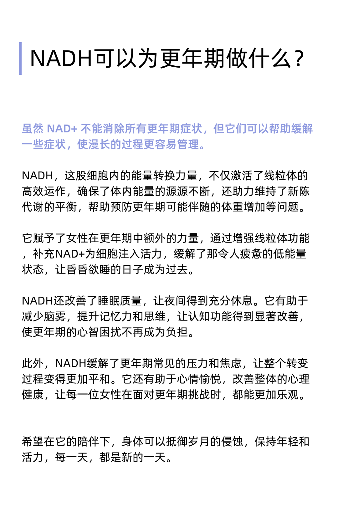NADH便是NAD前体之一。它作为NAD+的前体,能够提升细胞能量水平,激活长寿蛋白,从而延缓衰老、改善身体机能,对于女性来说,NADH 是守护健康的得力助手。