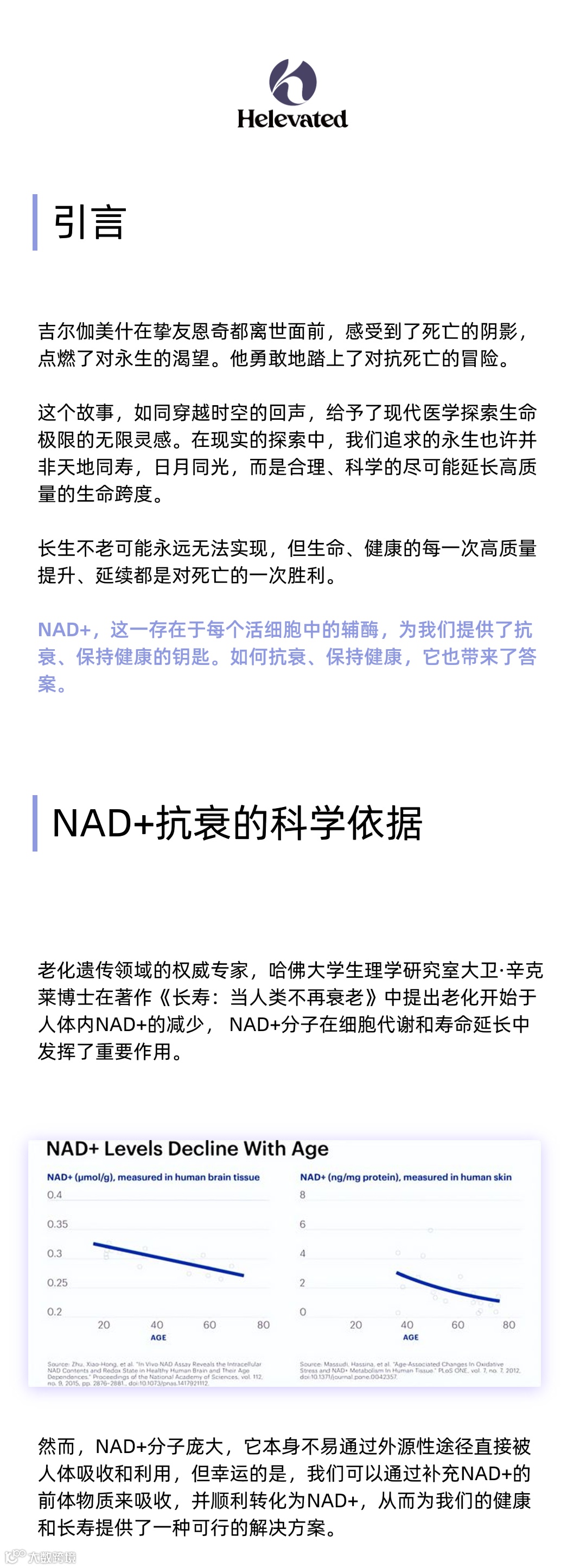 老化遗传领域的权威专家,哈佛大学生理学研究室大卫·辛克莱博士在著作《长寿:当人类不再衰老》中提出老化开始于人体内NAD+的减少, NAD+分子在细胞代谢和寿命延长中发挥了重要作用。