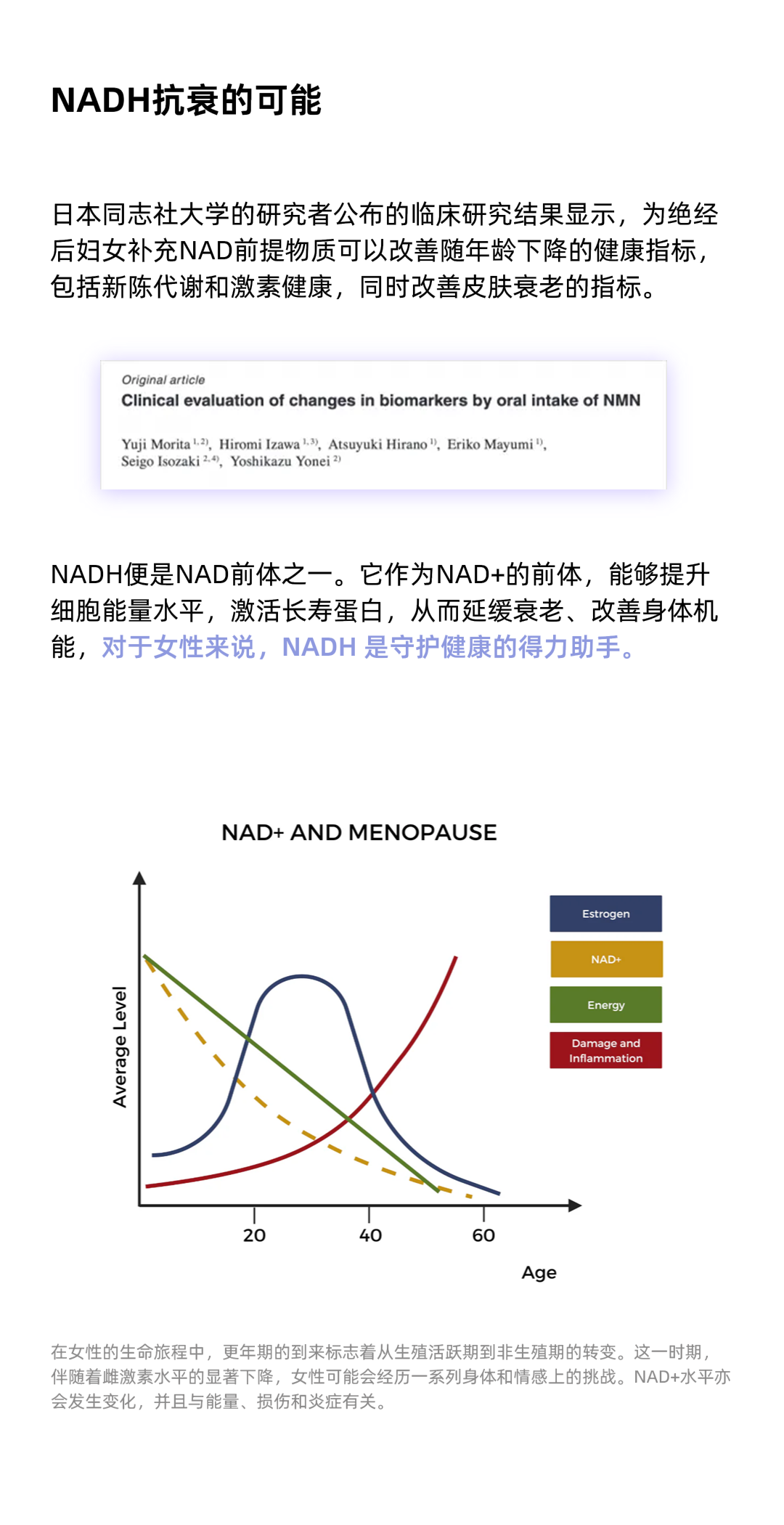 日本同志社大学的研究者公布的临床研究结果显示,为绝经后妇女补充NAD前提物质可以改善随年龄下降的健康指标,包括新陈代谢和激素健康,同时改善皮肤衰老的指标。