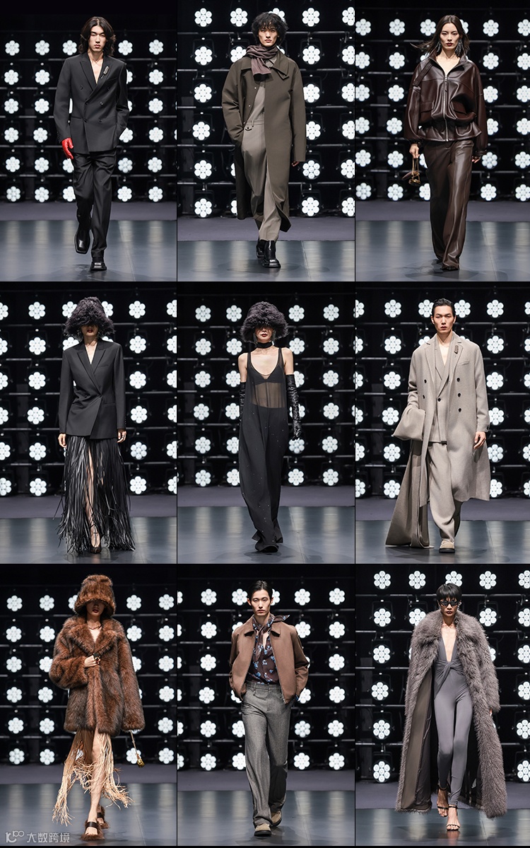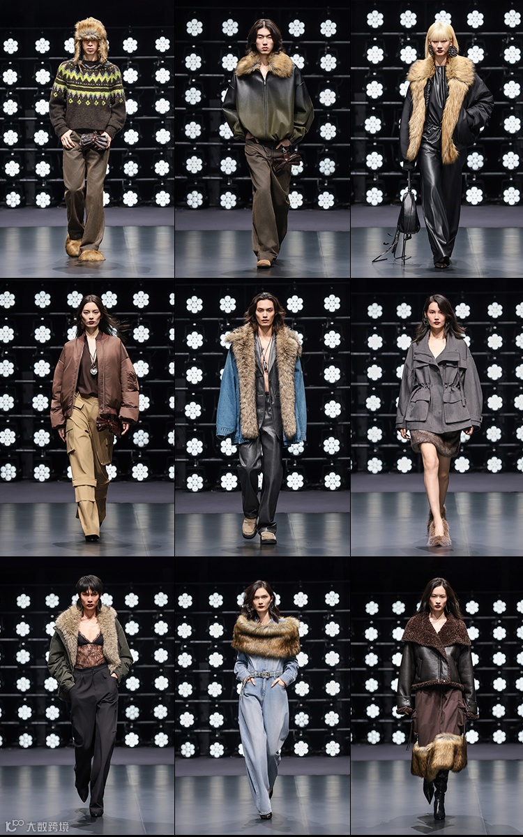 整场大秀以「Reflected City」为主题,聚焦都市生活与时尚的共生关系,通过「Urban Vogue 摩登锋尚」、「Playful Whimsy 软语周末」及「Midnight Safari 午夜游猎」三大篇章,串联起都市昼夜不同场景的穿搭叙事。