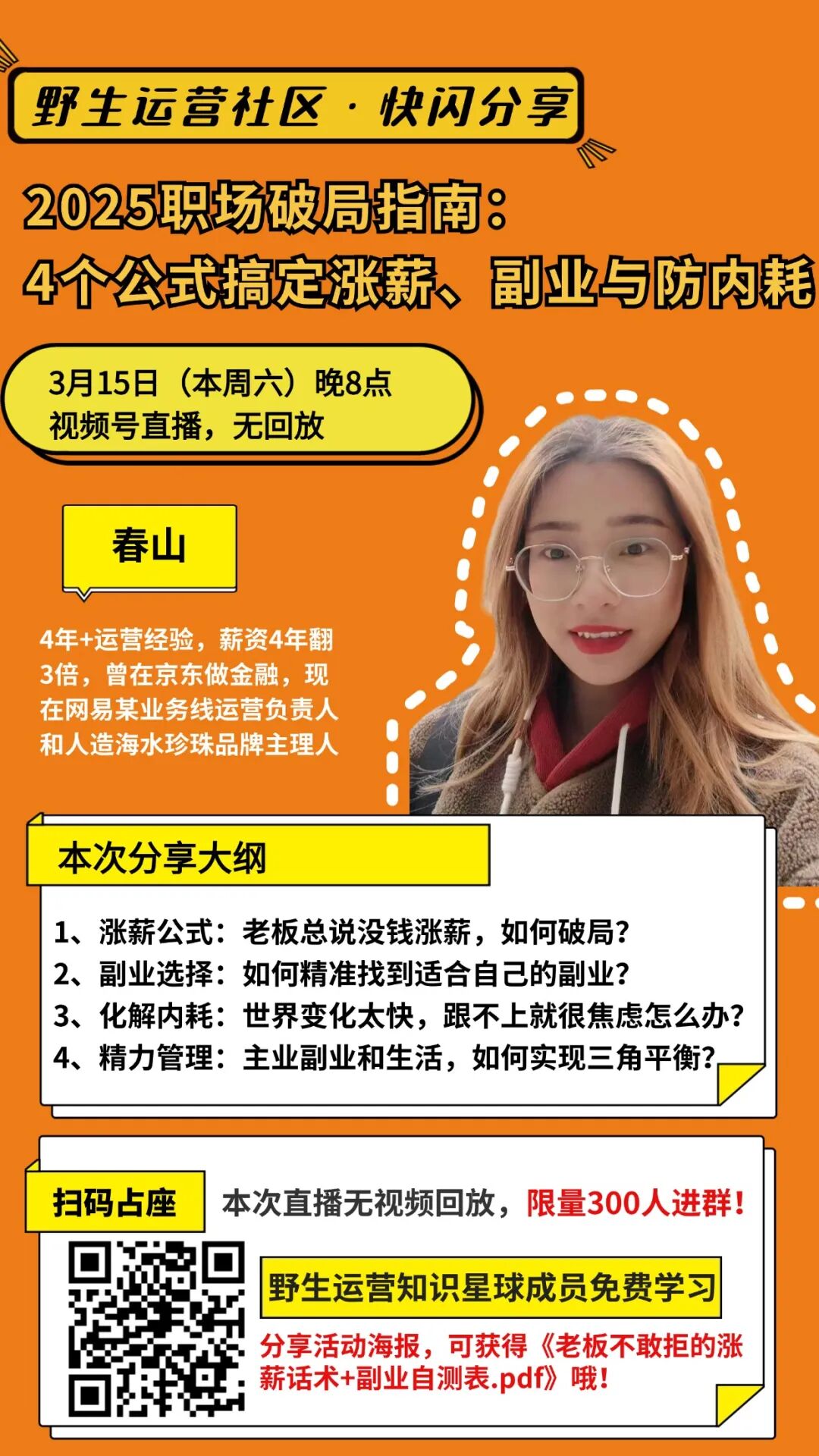 加入 or 续费野生运营知识星球成员,之后场场分享免费听