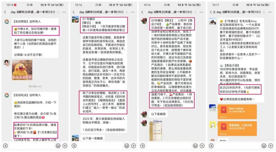 “知识书摊”活动的玩法是,各个摊主接力出摊,介绍他的“知识商品”,如读书笔记、书籍脑图、知识库搭建模板等,1元出售,想购买的人给摊主发专属红包即可领取商品。