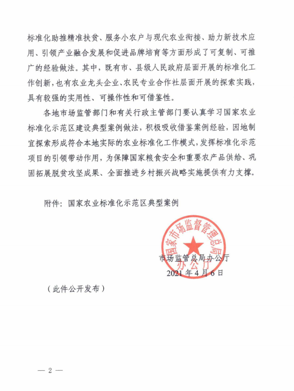 市场监管总局办公厅关于推介第一批国家农业标准化示范区典型案例的通知