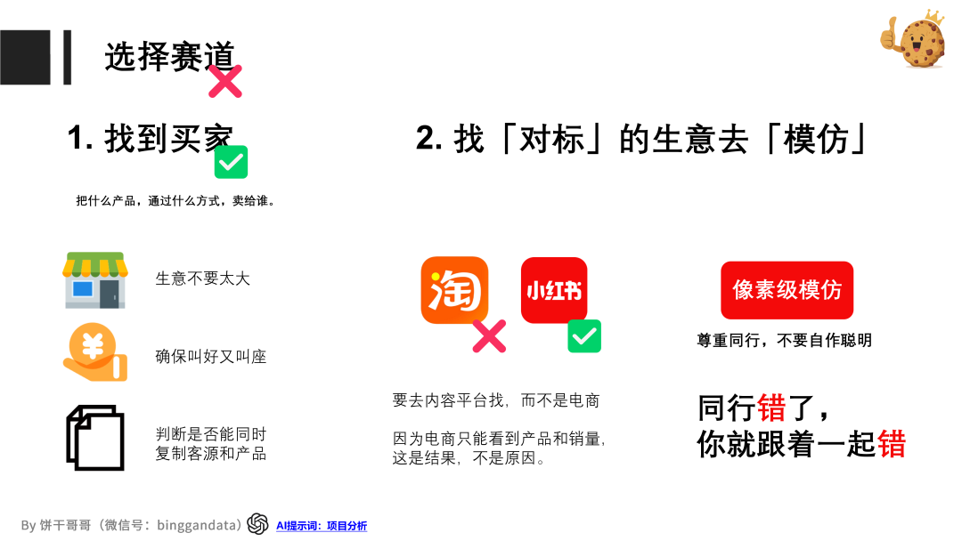 首先是选赛道,也就是确定要做啥生意。对于还没开展副业或者项目的朋友,我特别建议做“对标”,找对标生意像素级模仿。