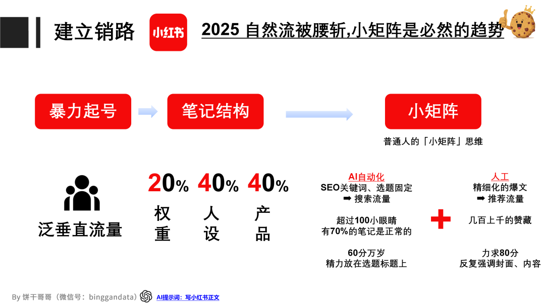 再说说小红书。小红书从去年10月开始自然流被腰斩,大家笔记小眼睛经常不到100很正常,现在主打付费投放,但那是商家玩法。咱普通人想快速成交就得走自然流,要做矩阵,普通人小矩阵一个人5到10个号能做到。