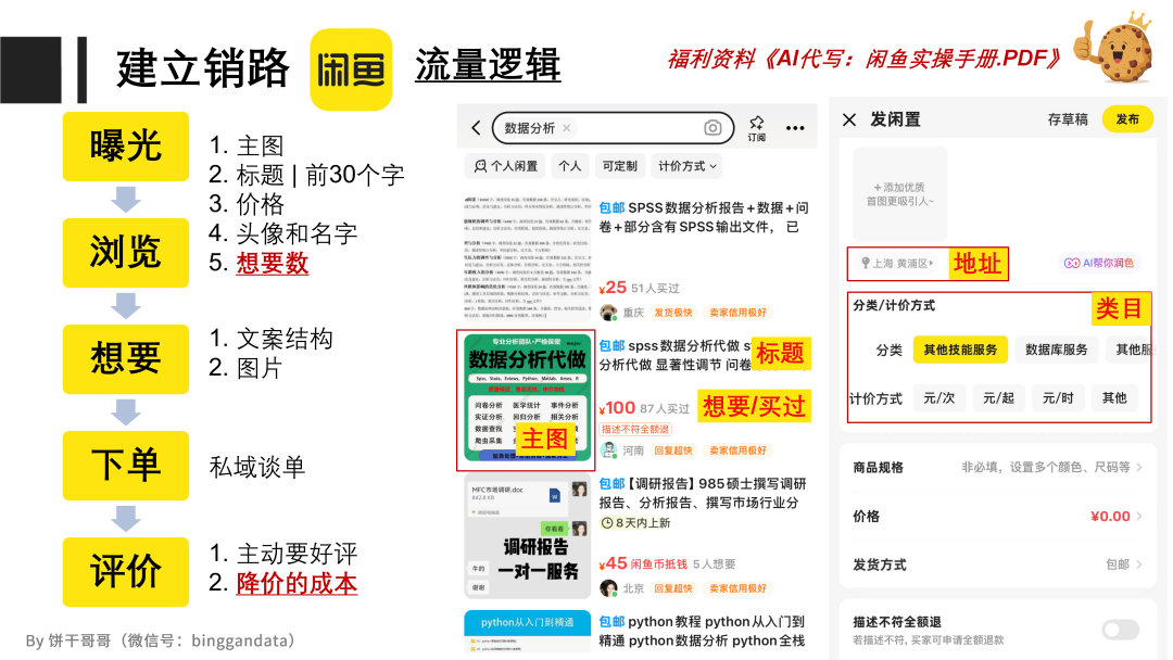 确定好赛道后,就得建立销路,也就是搞流量。像小红书虽然很火,但不是能快速拿到结果的路径。闲鱼就不一样了,它就是个做买卖的地方,用户进去就为了买东西,所以去闲鱼卖产品、服务,成交效率更高。