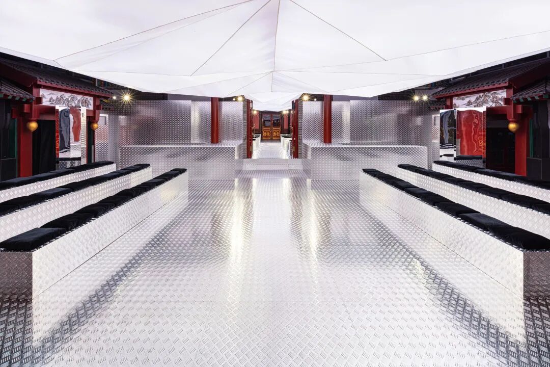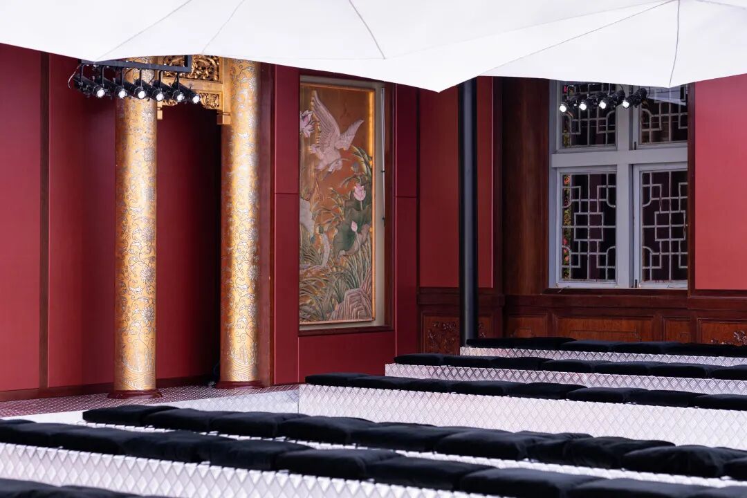 本次时装秀在郡王府银安殿发布,由AMO创作置景,ACTIVATION EVENTS最终呈现秀场空间。透明天花板与立体三角形空间的垂直隔板投射温馨柔和的粉色灯光,与府邸庭院池塘中的倒影相映成趣。地板与落座区域覆以防滑金属板,镜面设计增强光线与色彩,与精致照明元素形成鲜明对比。