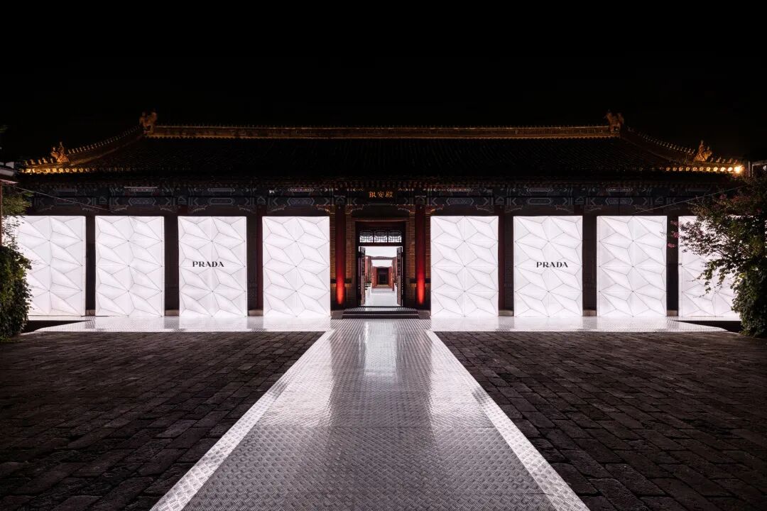 The show was presented in the Yin'an Hall of the Prince Jun's Mansion and set design by AMO and the scenographic was brought to life by ACTIVATION EVENTS. Bright ceilings and vertical partitions of three-dimensional triangular modules cast a warm ambience of soft pink light, emphasized by reflections in the ponds of the palace grounds. In contrast with crafted lighting elements, floor and the seating areas are covered with treadplate metal sheets, a mirroring surface to amplify light and color.