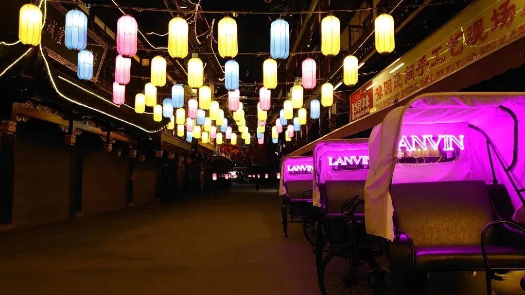 豫园商城的街区式广场、巷弄以及高空区域悉数开放,在豫园传统的非遗千灯及三维激光秀的印衬下,光影交错。秀场内随处可见的中式元素如:荷花池、灯笼、牌匾、观音雕像等,与LANVIN的法式浪漫碰撞出了不一样的视觉火花。