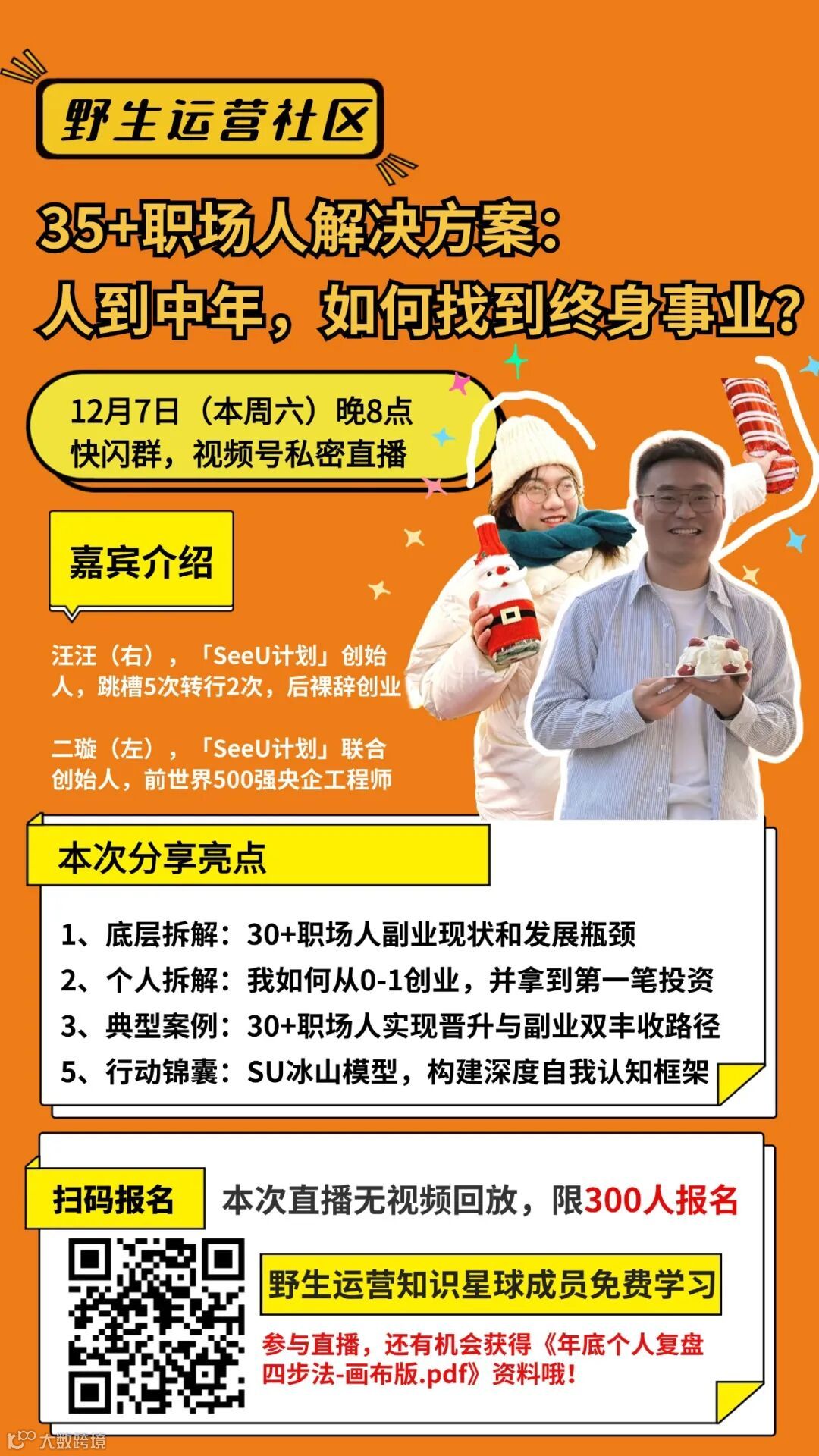 这周六晚8点,我邀请来我认识的新朋友「SeeU计划」的创始人和联合创始人,两个人共同和你分享《35+职场人解决方案:人到中年,如何找到终身事业》,以系统、有根据、可实践方式给你一套落地方法,让你找到你的第二曲线,和终身事业!参与直播还将有机会获得《年底个人复盘四步法-画布版.pdf》哦