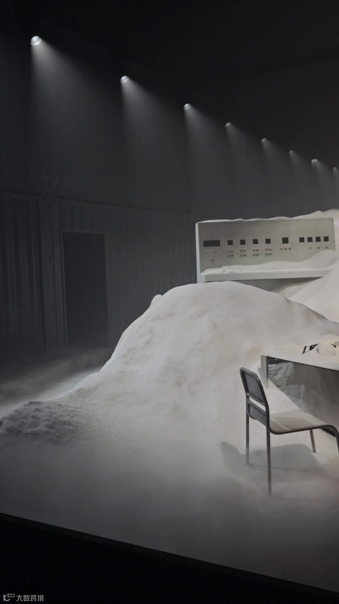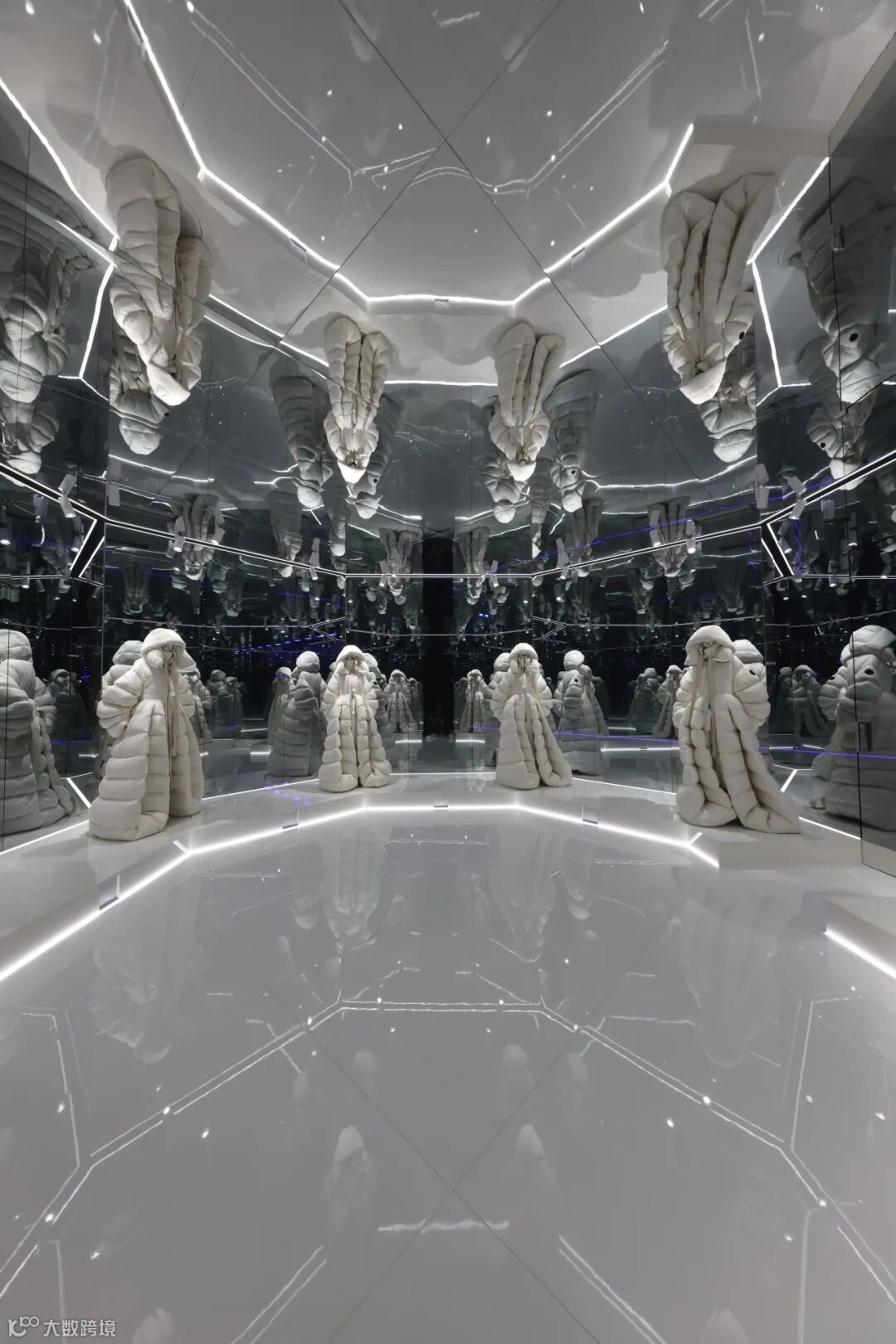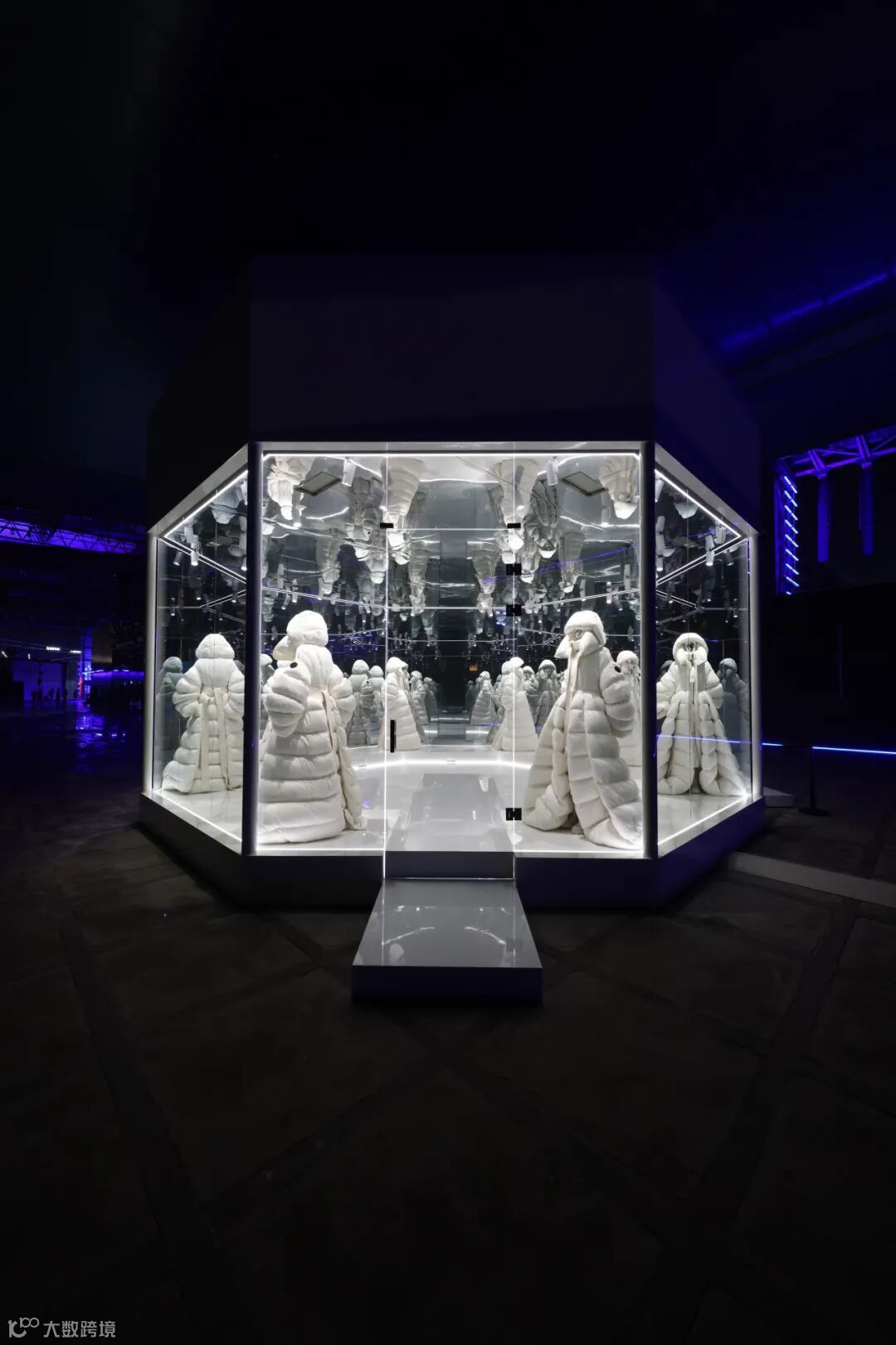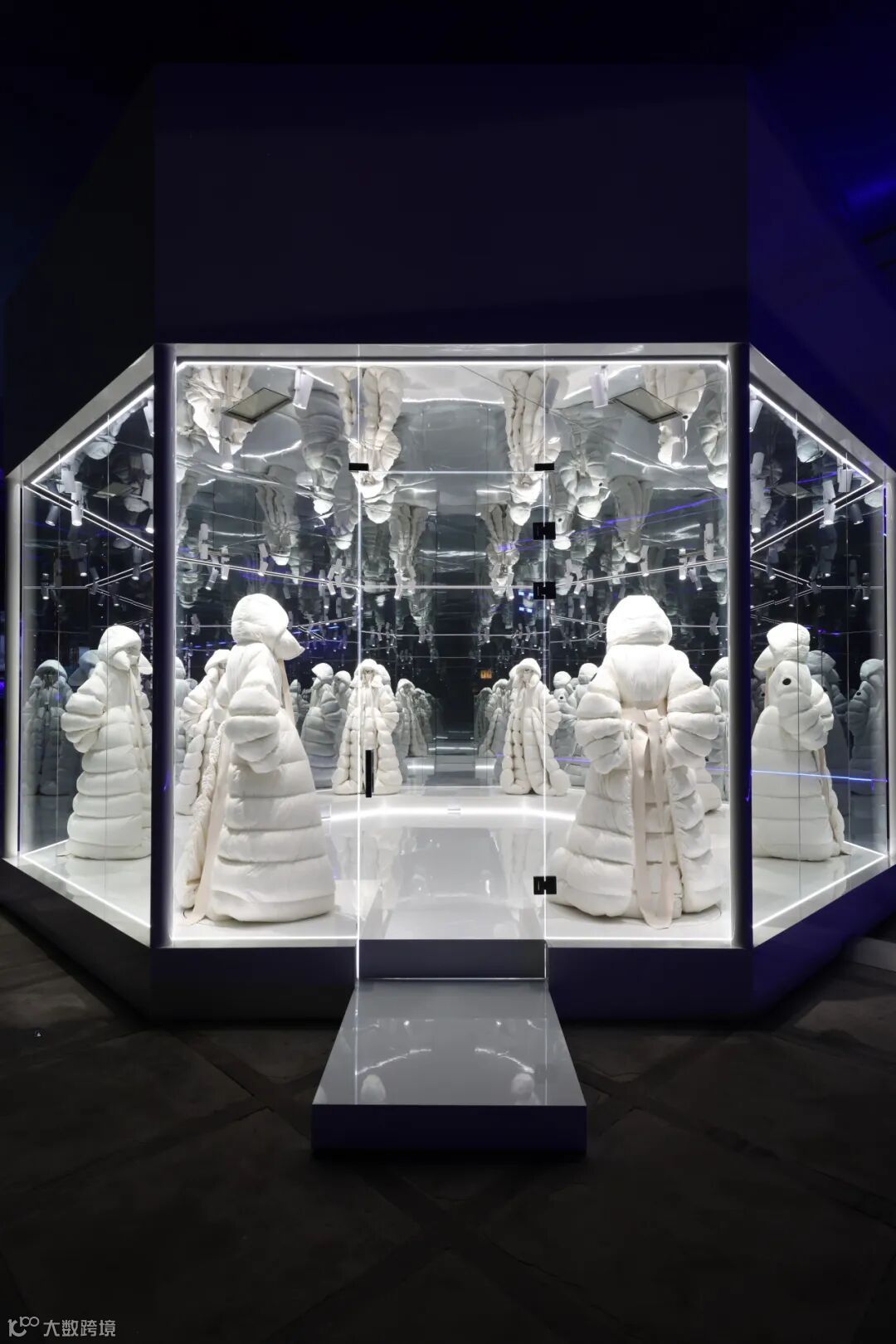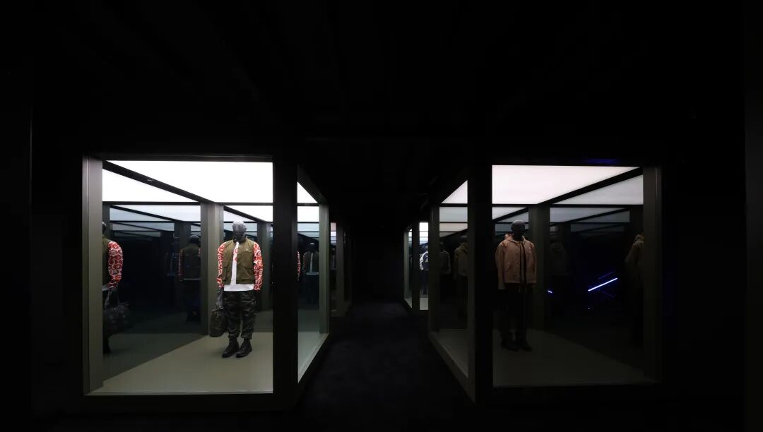 Edward Enninful空间打造了一个极端环境,一边是极地冰山,一边是黄色沙丘。模特们身着Edward Enninful与Moncler合作款在其中进行静态展示,通过墙面上覆盖的硕大镜子,为观众带去多重的感官体验。