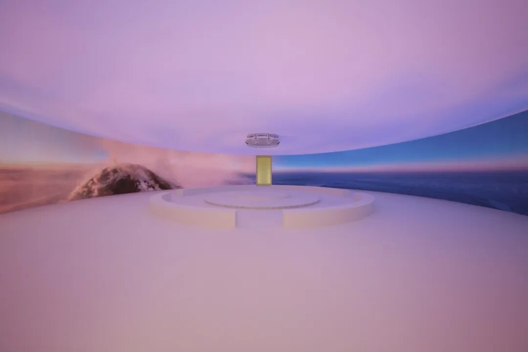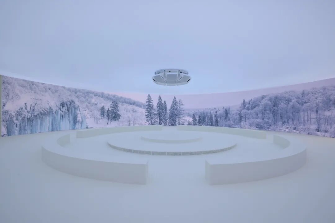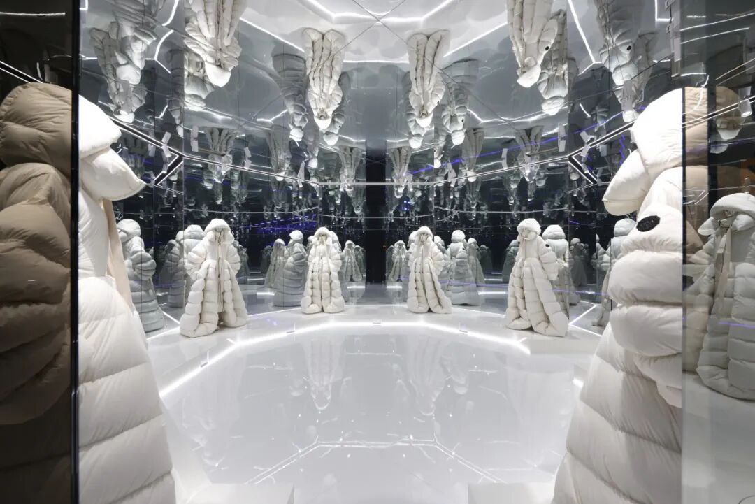 在创意总监 Lucie 和 Luke Meier 的引领下,Jil Sander 首次与 Moncler Genius 合作。展区诠释了演绎不息的理念,在一个圆形空间内循环展示各种模型,并以360度高科技弧形屏幕墙为框架,描绘自然之美和大气层天空光照。