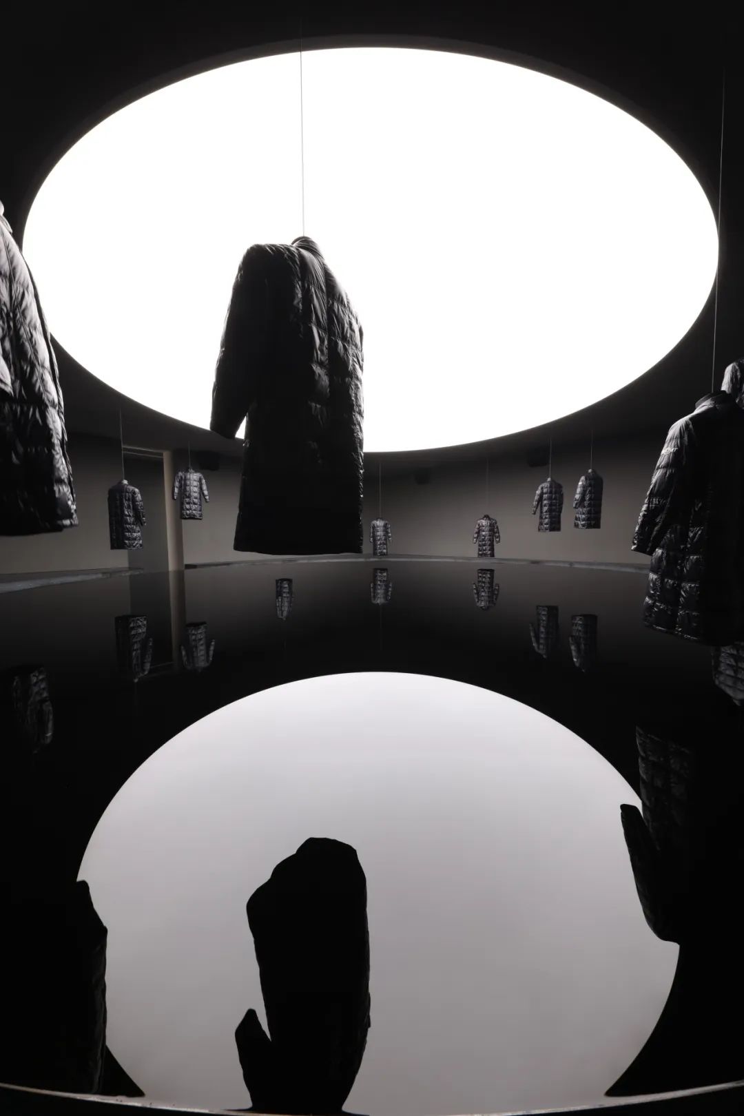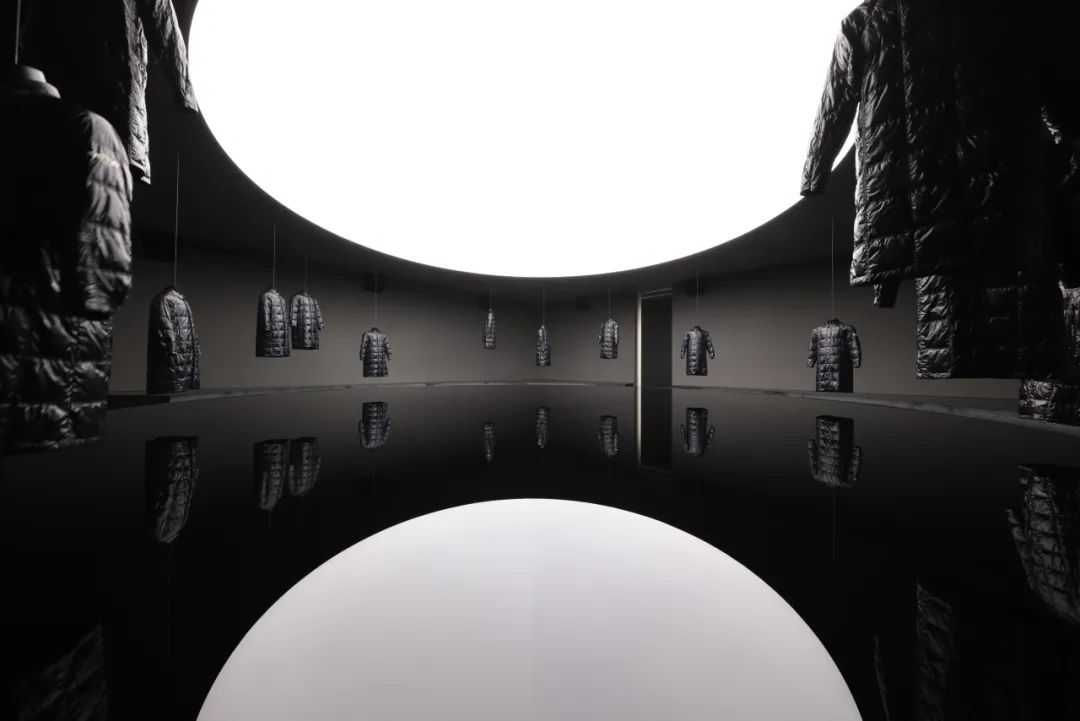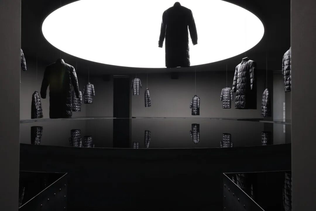 被誉为街头潮流教父的藤原浩(Hiroshi Fujiwara)再次与 Moncler 合作,呈现了他标志性的极简主义设计。该空间是与雕塑家Richard Wilson RA合作建成,将单品悬于空中,倒映于蓄水的地板表面,从而创造出《Looking Glass 2024》 这件充满倒置感的艺术作品。