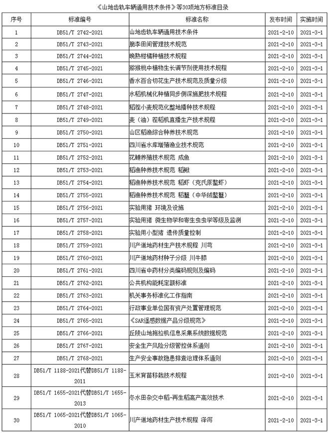 导读:据四川省市场监督管理局网站消息,近日,四川省市场监督管理局批准发布30项地方标准,其中涉及种养植业技术规范、