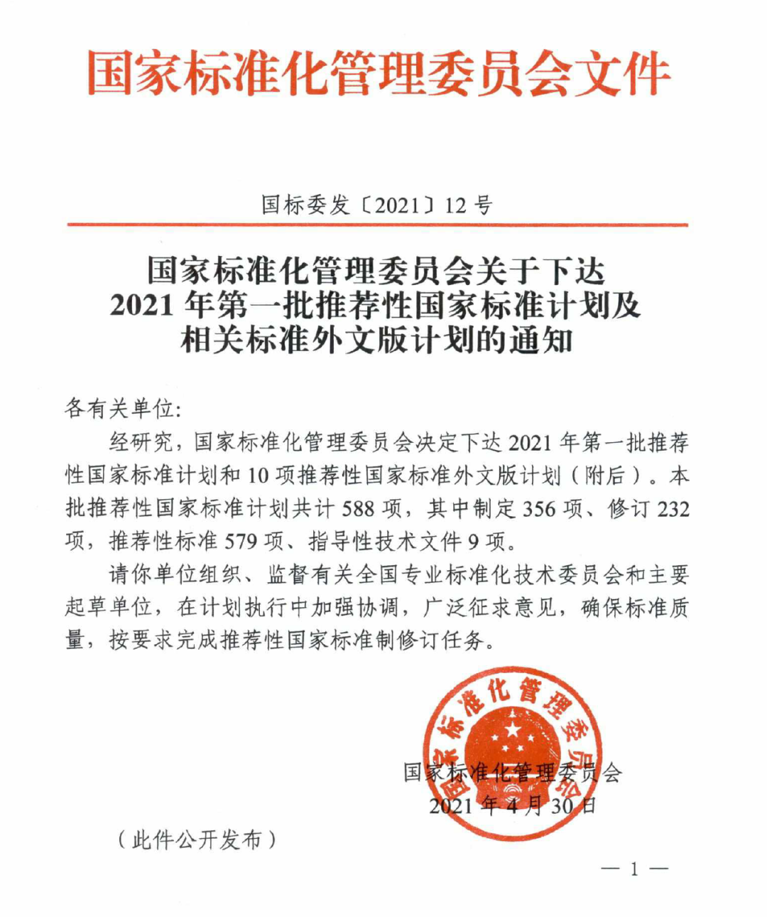 国家标准化管理委员会关于下达2021年第一批推荐性国家标准计划及相关标准外文版计划的通知