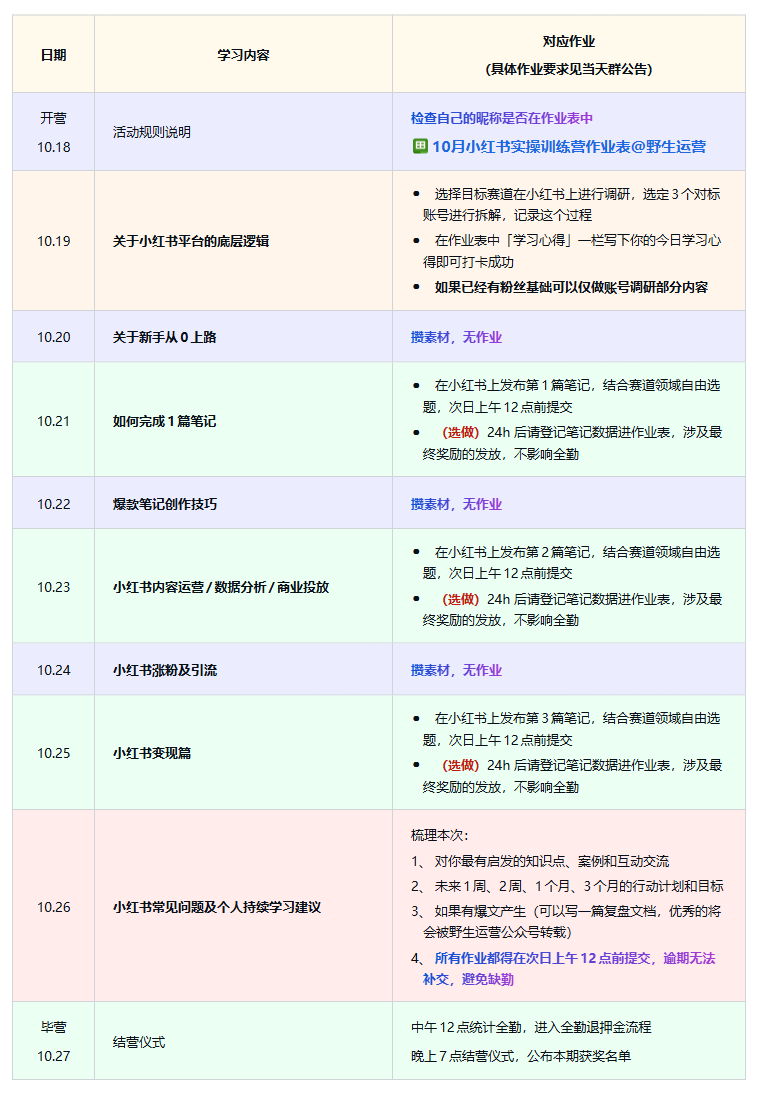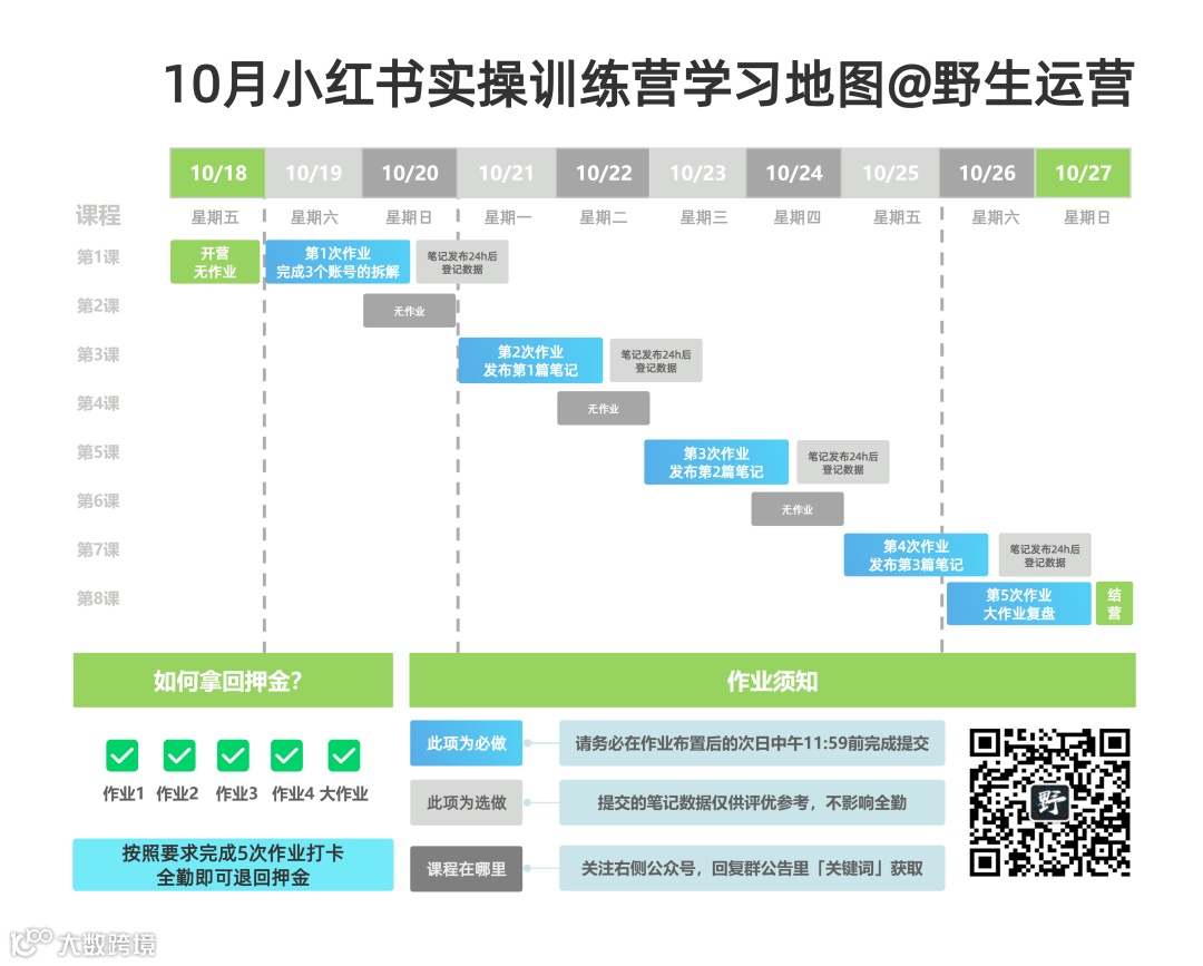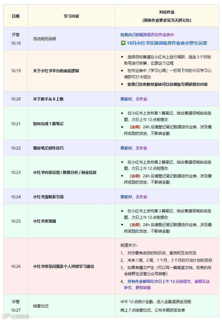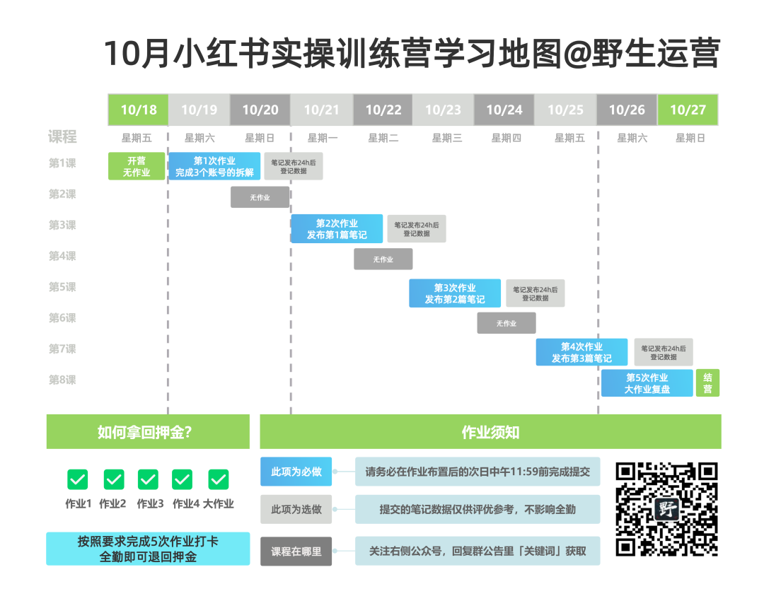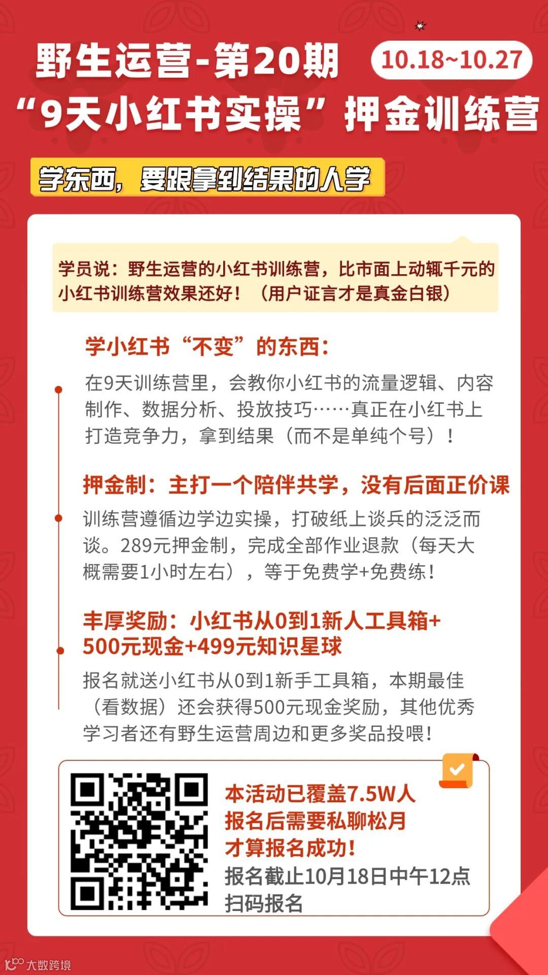 话不多说,第20期野生运营“9天小红书实操”押金制训练营(10.18~10.27)开始报名,人满就截止,手慢无(最近也在考虑,要不要 2 个月办一期,降低些频率)。