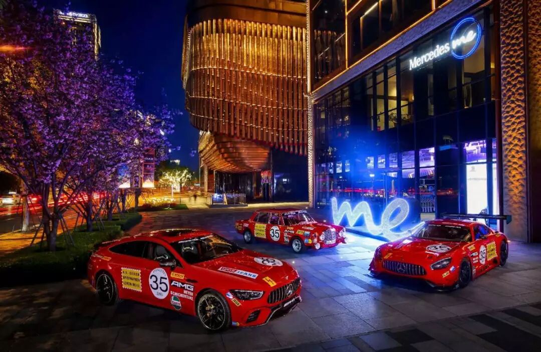 Mercedes me 上海外滩体验店前,蜿蜒赛道与巨型发光me Logo占据了整个视野。通体赤红的AMG成名作「红猪」300SEL 6.8 AMG空降于此。