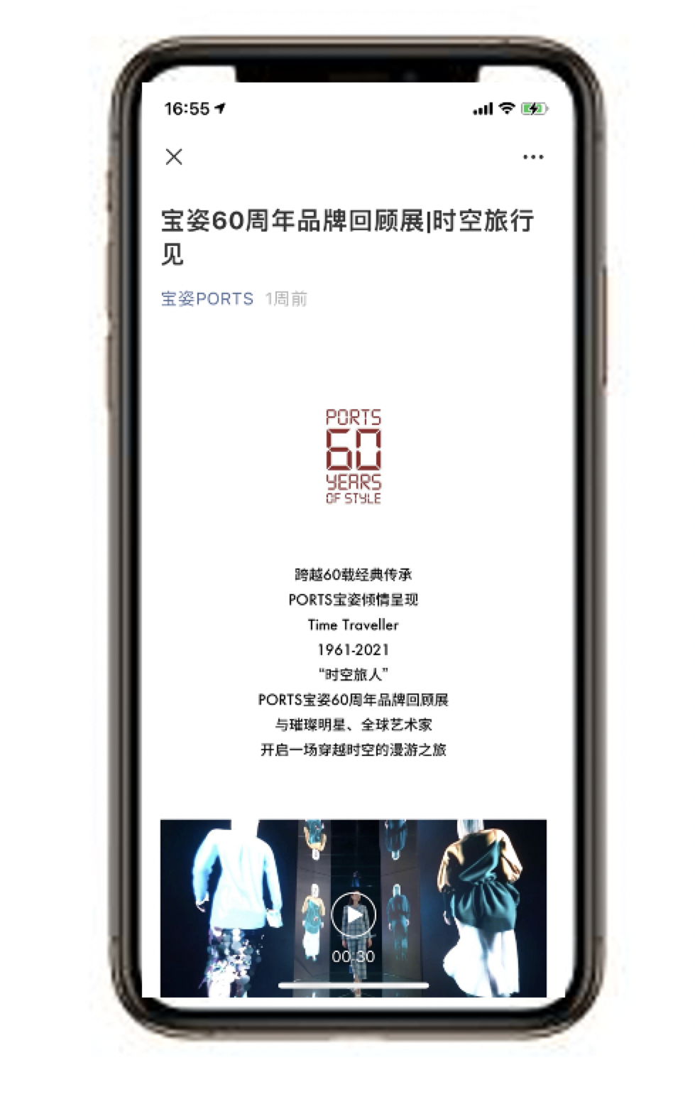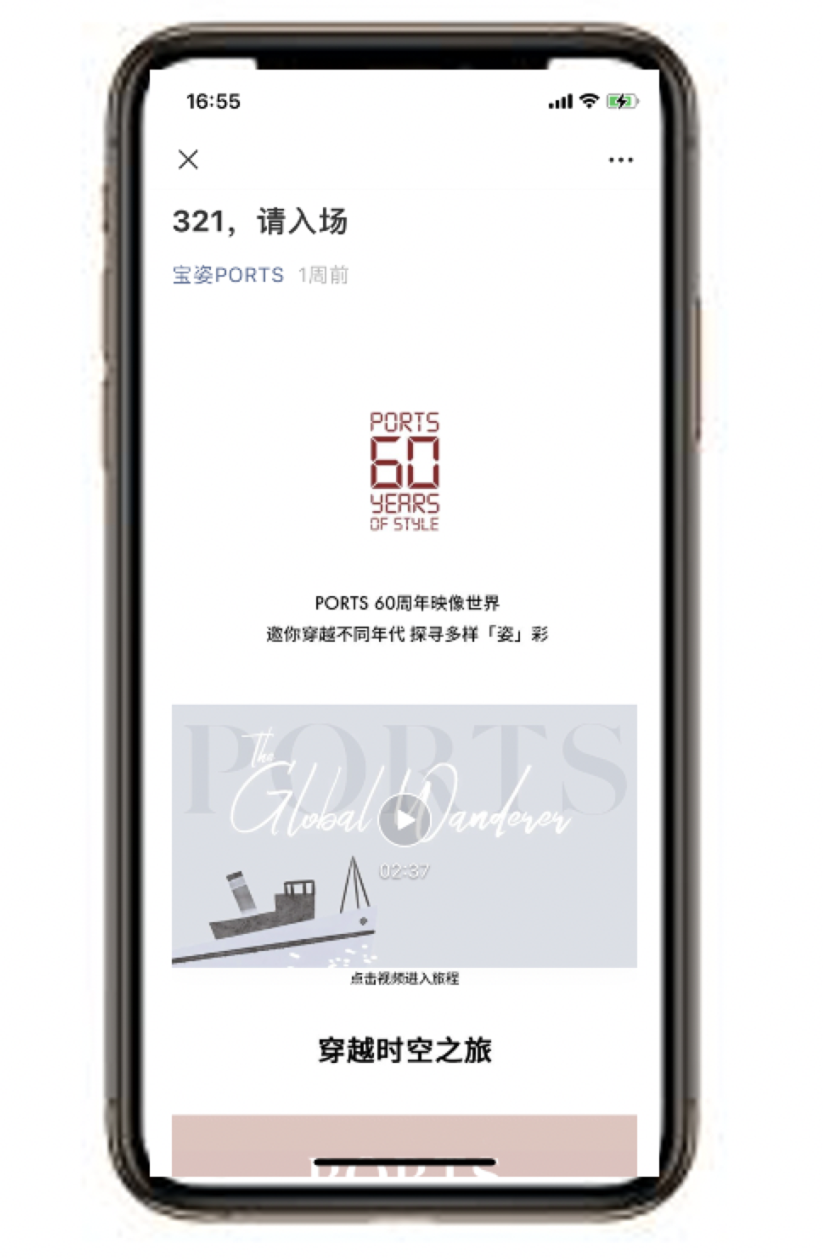 ACTIVATION DIGITAL 与PORTS官方旗下四个品牌微信公众号:宝姿PORTS,PORTS1961,PORTSPURE,PORTS V上发布「TIME TRAVELLER 时空旅人」、「321,请入场」、「宝姿60周年品牌回顾展 | 时空旅行见」推文,推广宣传「TIME TRAVELLER」PORTS 60周年品牌回顾展,讲述品牌在时代变迁中的美学故事。