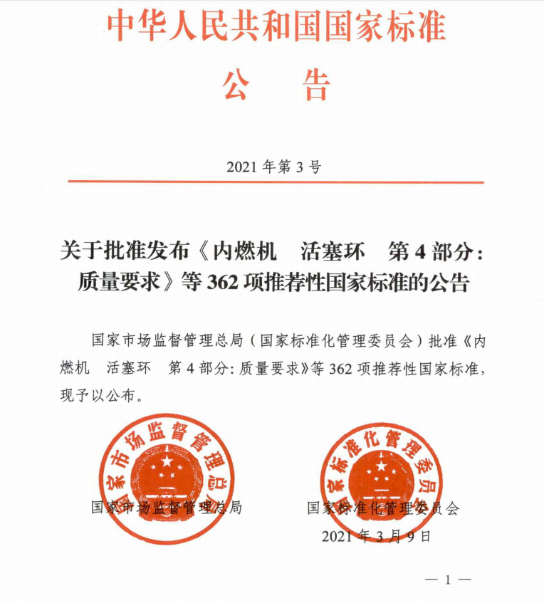 关于批准发布《内燃机 活塞环 第4部分:质量要求》等362项推荐性国家标准的公告