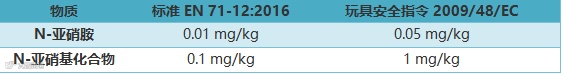 *注:标准EN 71-12:2016中第4.2条表2第a点中的限值(即针对意图供36个月以下儿童使用,且意图或可能放入口中的弹性体玩具的限值)低于玩具安全指令2009/48/EC附件II第III部分第8点中规定的符合的限值。这些限值具体如下:
